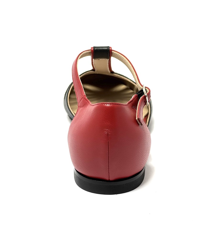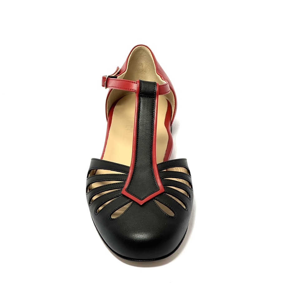 Scarpa da ballo per donna ottima per ballo da sala liscio boogie woogie swing e lindy hop punta chiusa articolo 482 sottopiede in memory foam tomaia in pelle nera con riporti in pelle rossa suola in cuoio pomiciato tacco 10