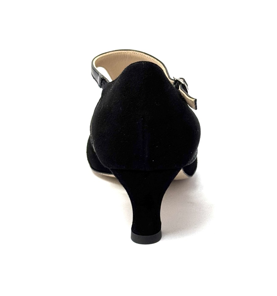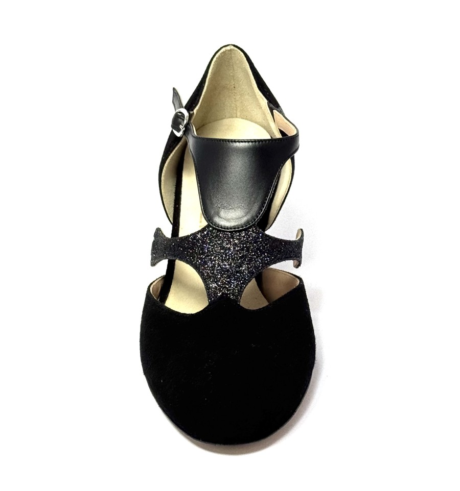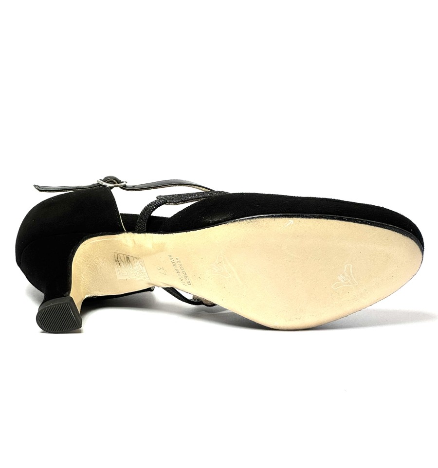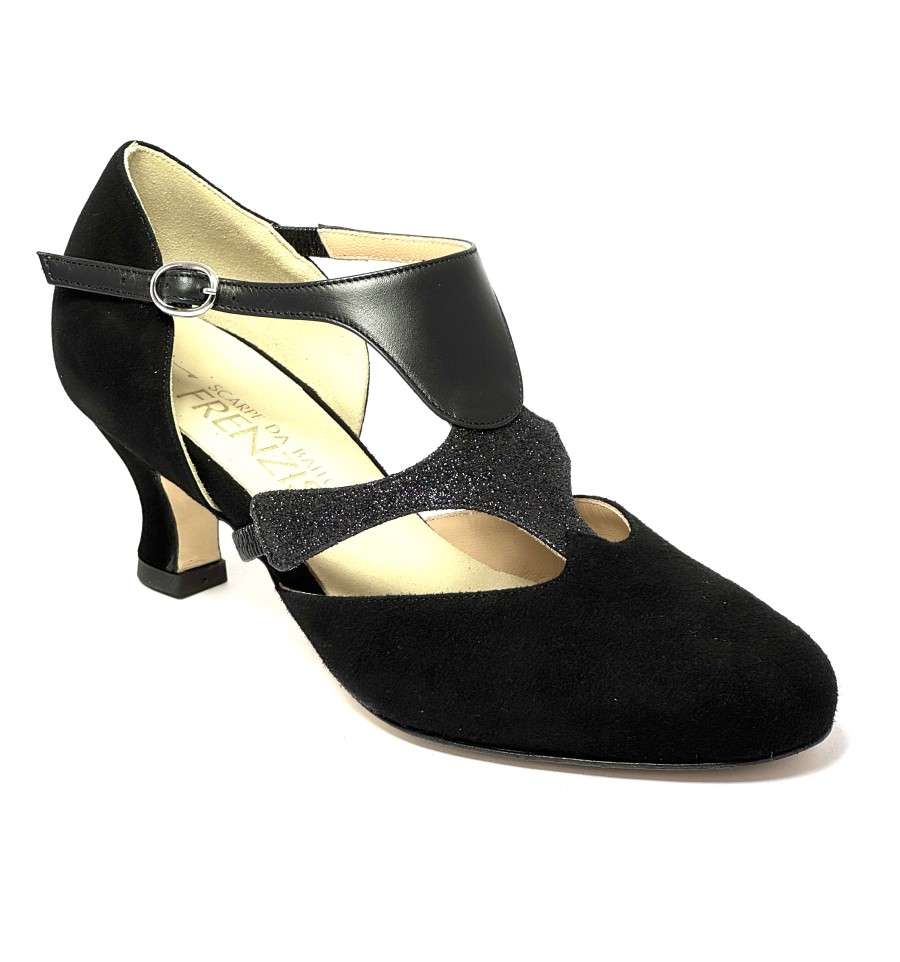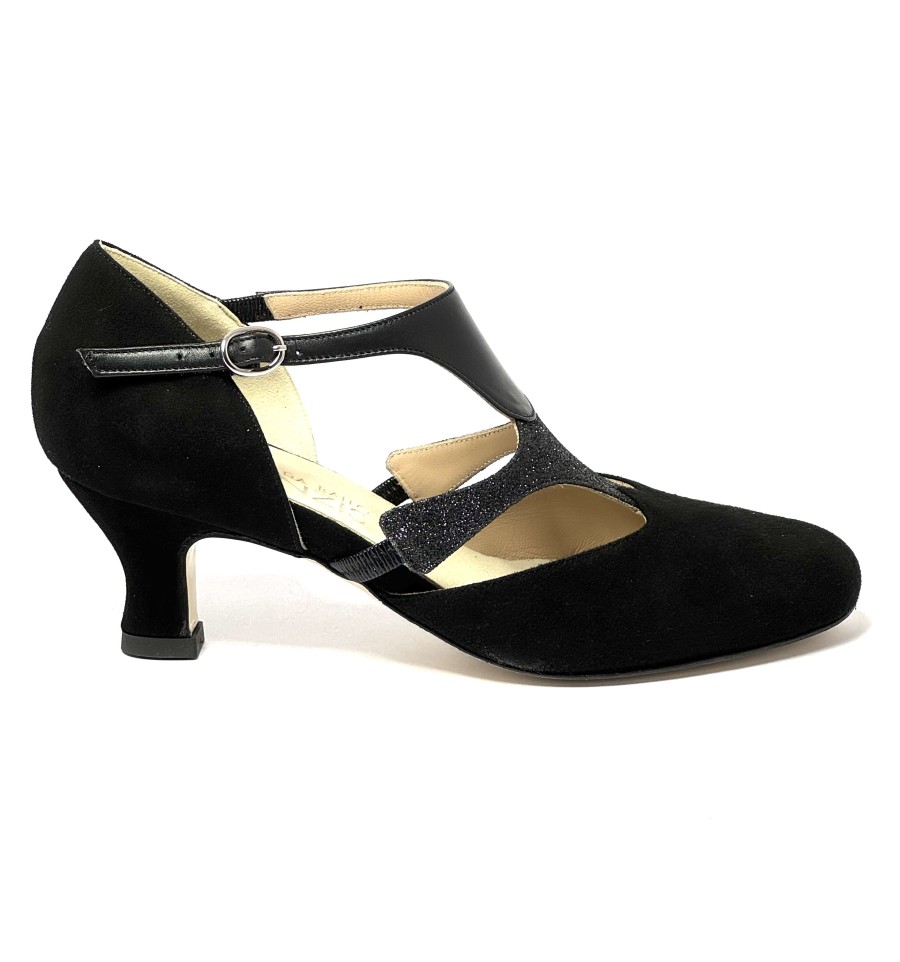 Scarpa da ballo per donna ottima per ballo da sala liscio latino americano tango argentino punta chiusa articolo 220 sottopiede memory foam tomai in camoscio nero con riporti in pelle e glitter nero suola in cuoio pomiciato tacco 50 a rocchetto