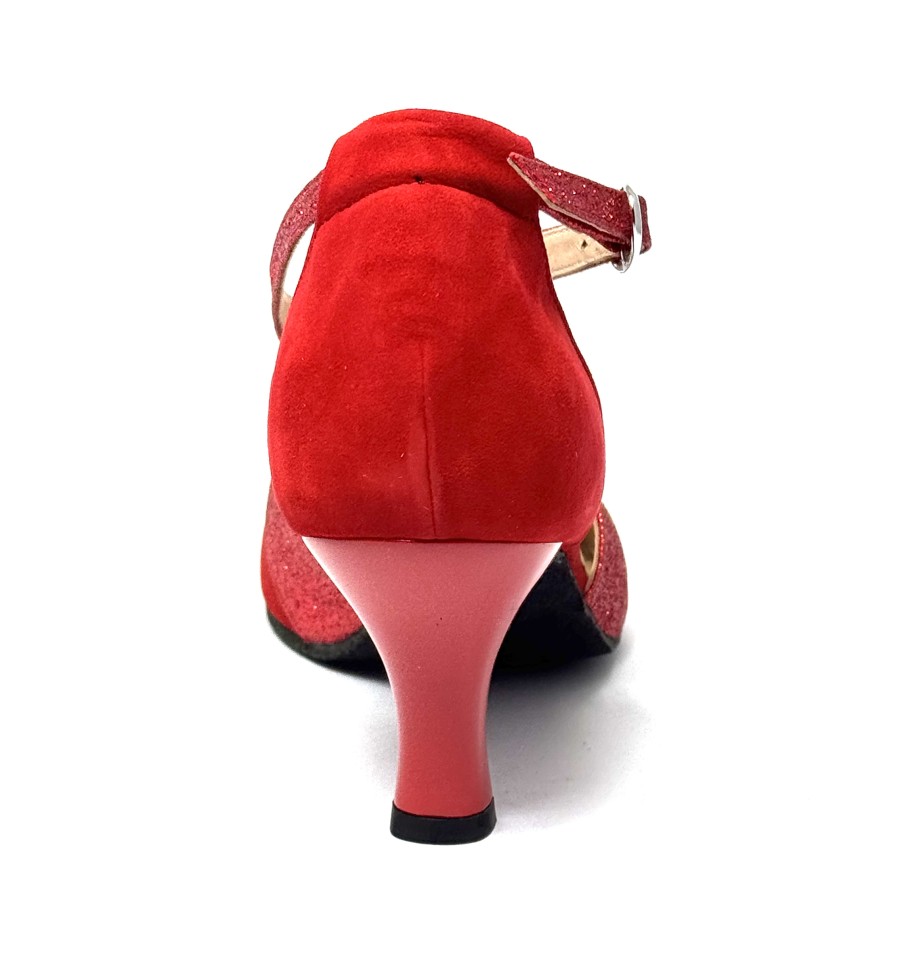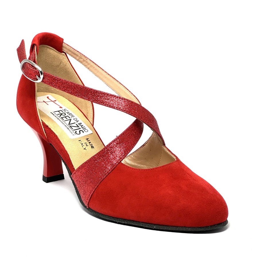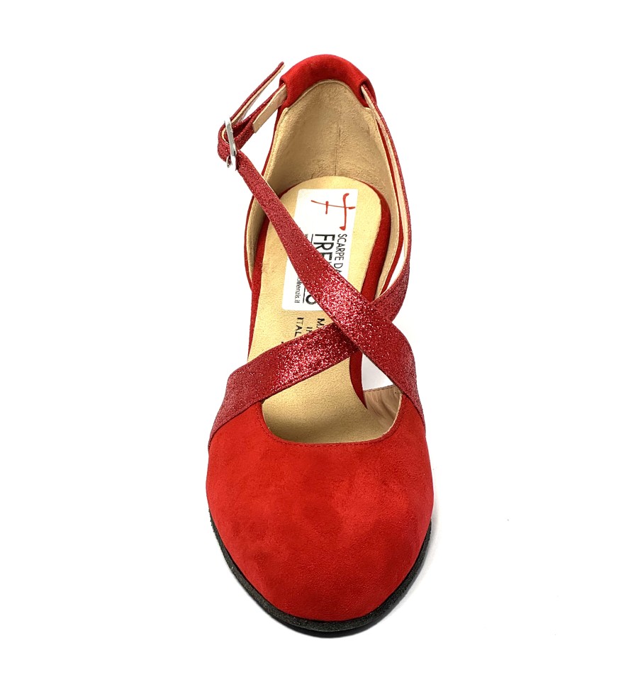 Scarpa da ballo per donna ottima per ballo da sala liscio latino americano e tango argentino punta chiusa articolo 100 sottopiede in memory foam tomaia in camoscio rosso con riporti in glitter rosso suola in bufalo tacco 65 laccato rosso