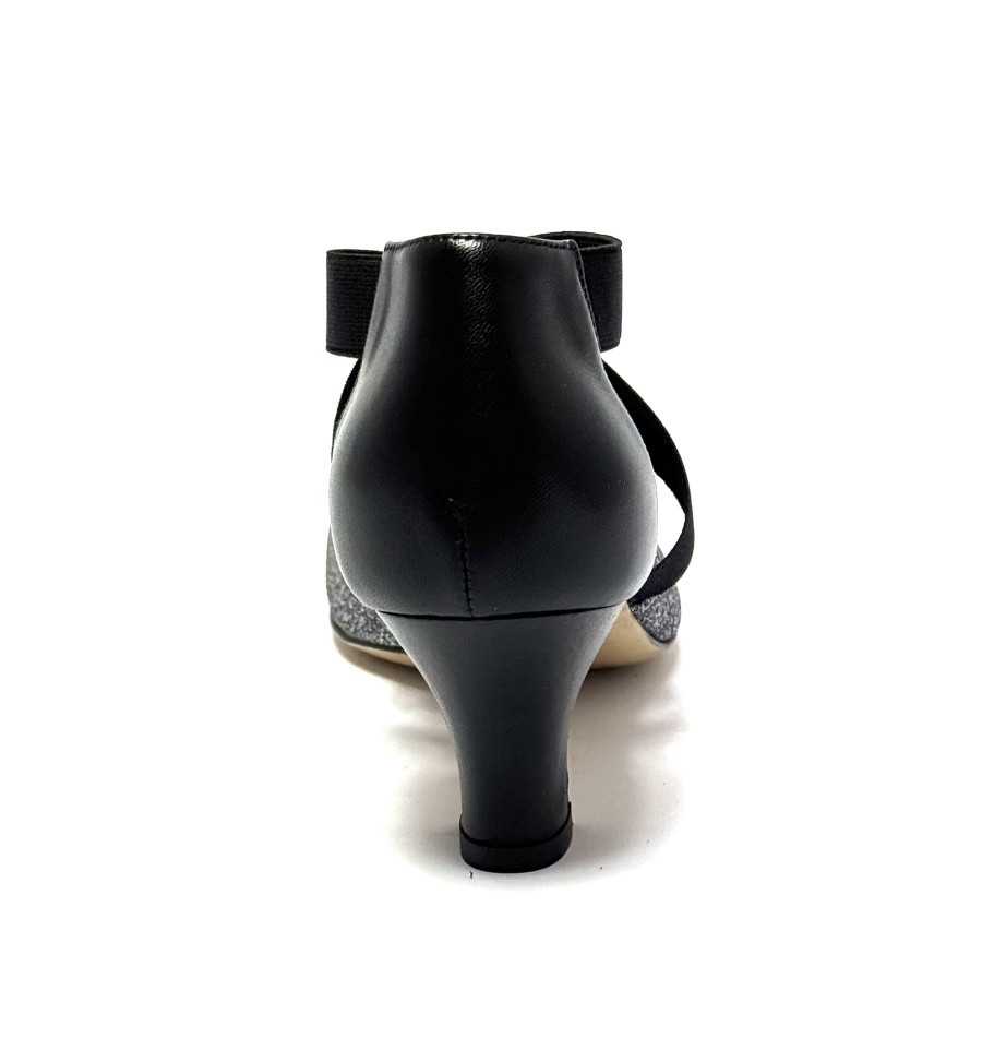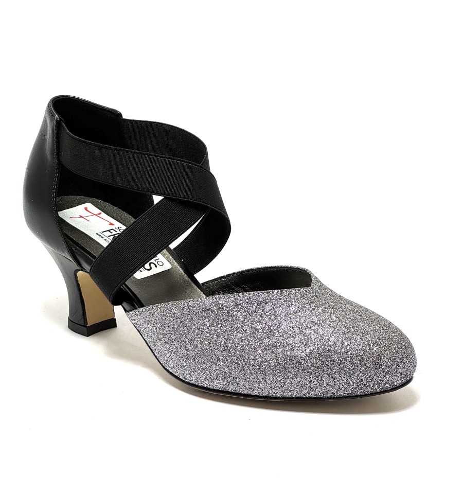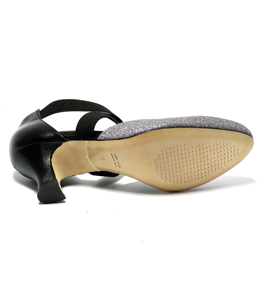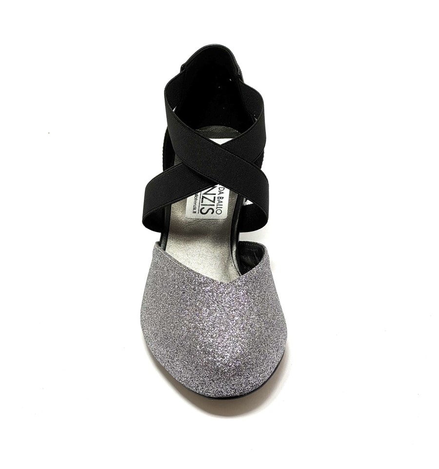 Scarpa da ballo per donna ottima per ballo da sala liscio latino tango punta chiusa articolo 07F sottopiede in memory foam tomaia in glitter canna di fucile con riporti in pelle nero elastici sul collo del piede suola in cuoio pomiciato tacco 50