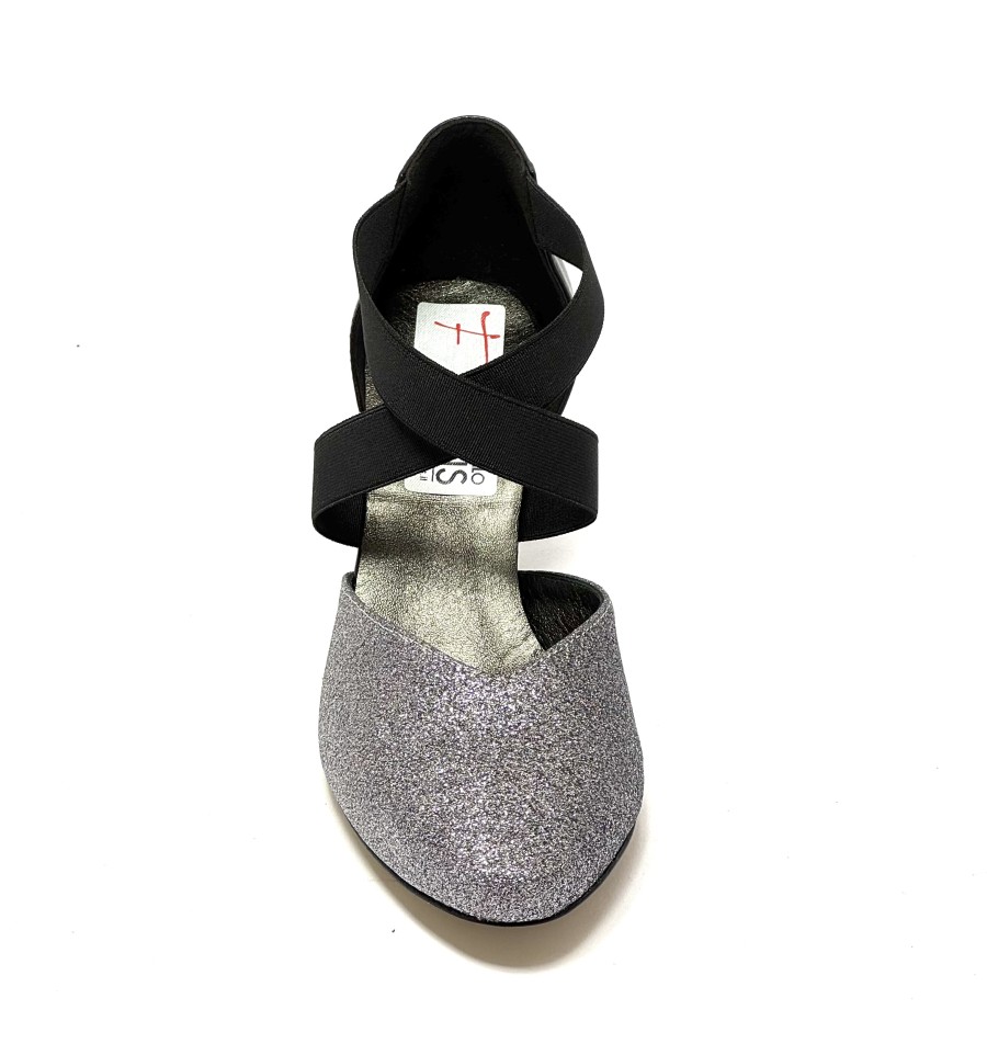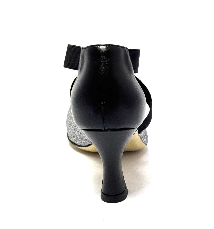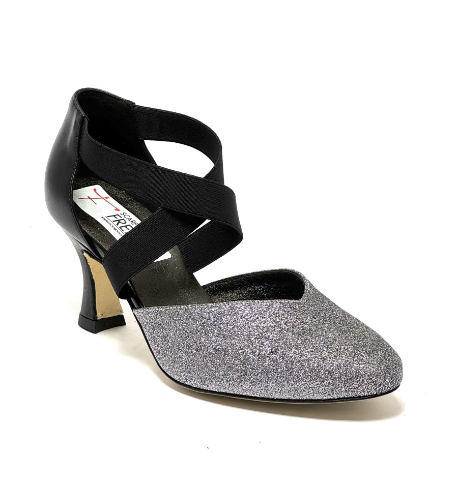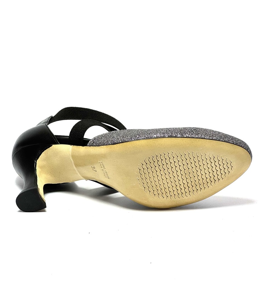 Scarpa da ballo per donna ottima per ballo da sala liscio latino tango punta chiusa articolo 07F sottopiede in memory foam tomaia in glitter canna di fucile con riporti in pelle nera elastici sul collo del piede suola in cuoio pomiciato tacco 70 a rocchetto