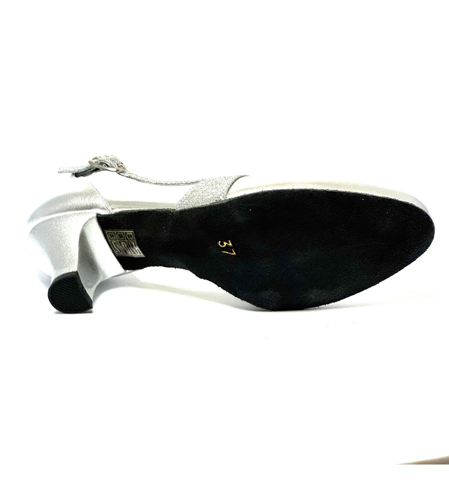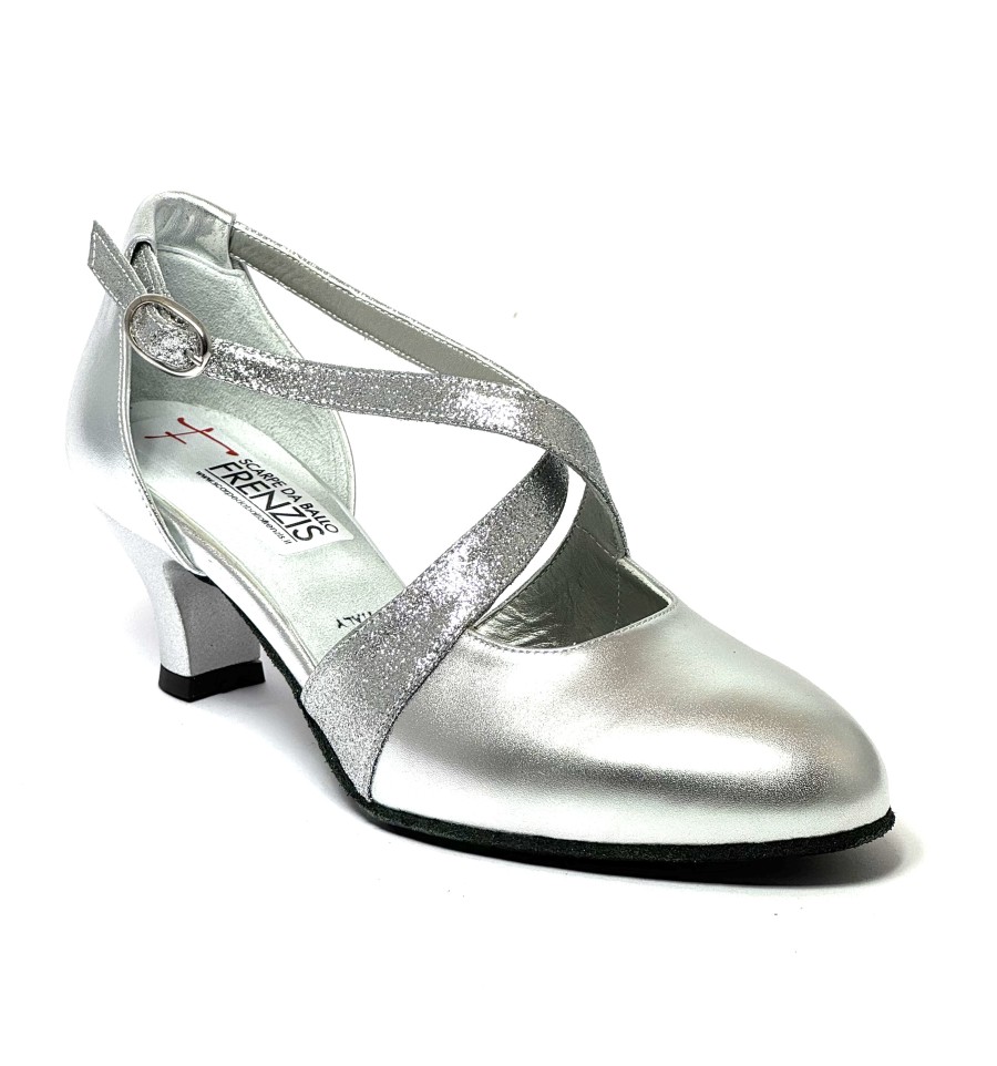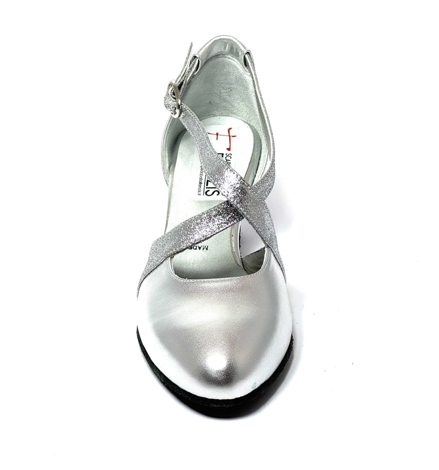 Scarpa da ballo per donna ottima per ballo da sala liscio latino americano tango argentino punta chiusa articolo 100 sottopiede in memory foam tomaia in pelle argento con riporti in glitter argento suola bufalo tacco 50