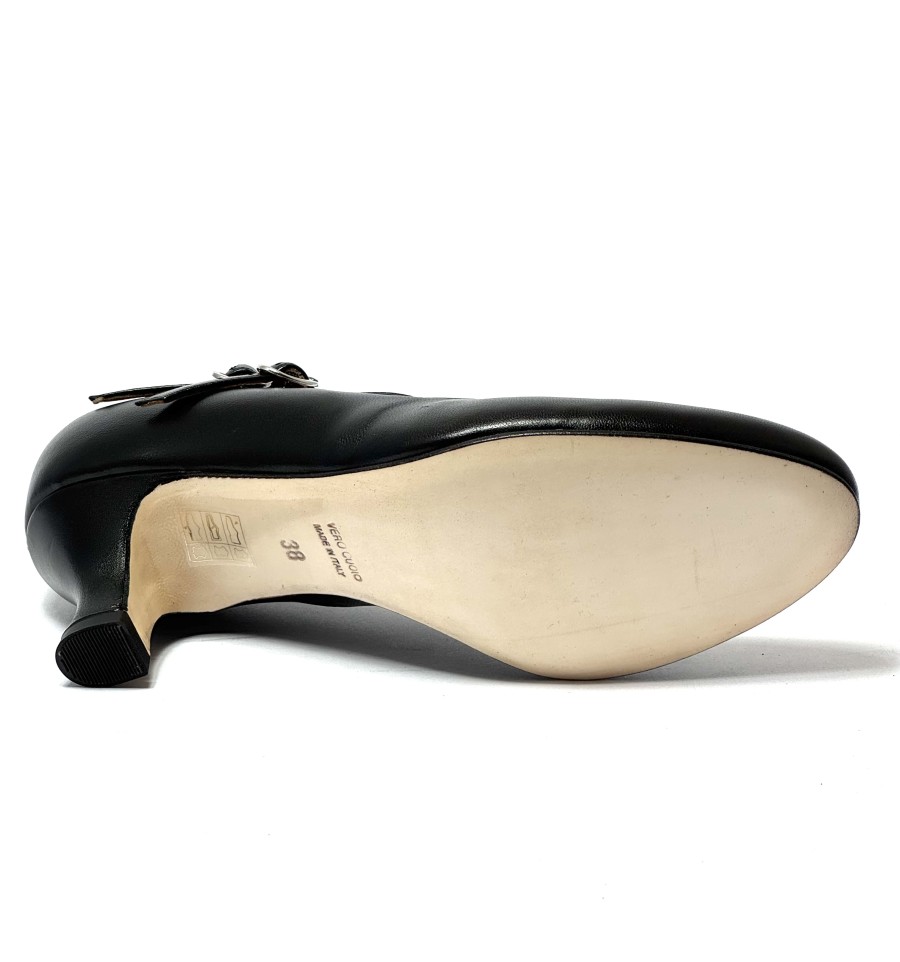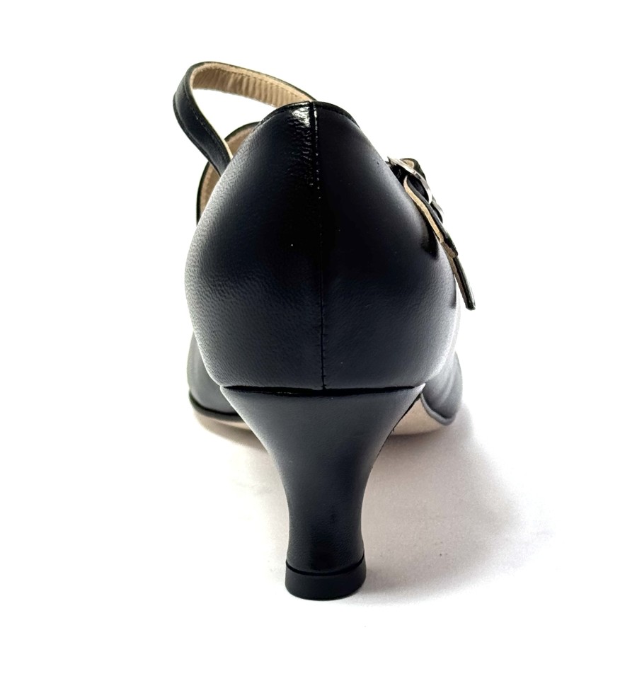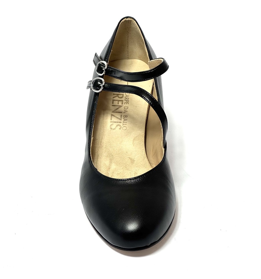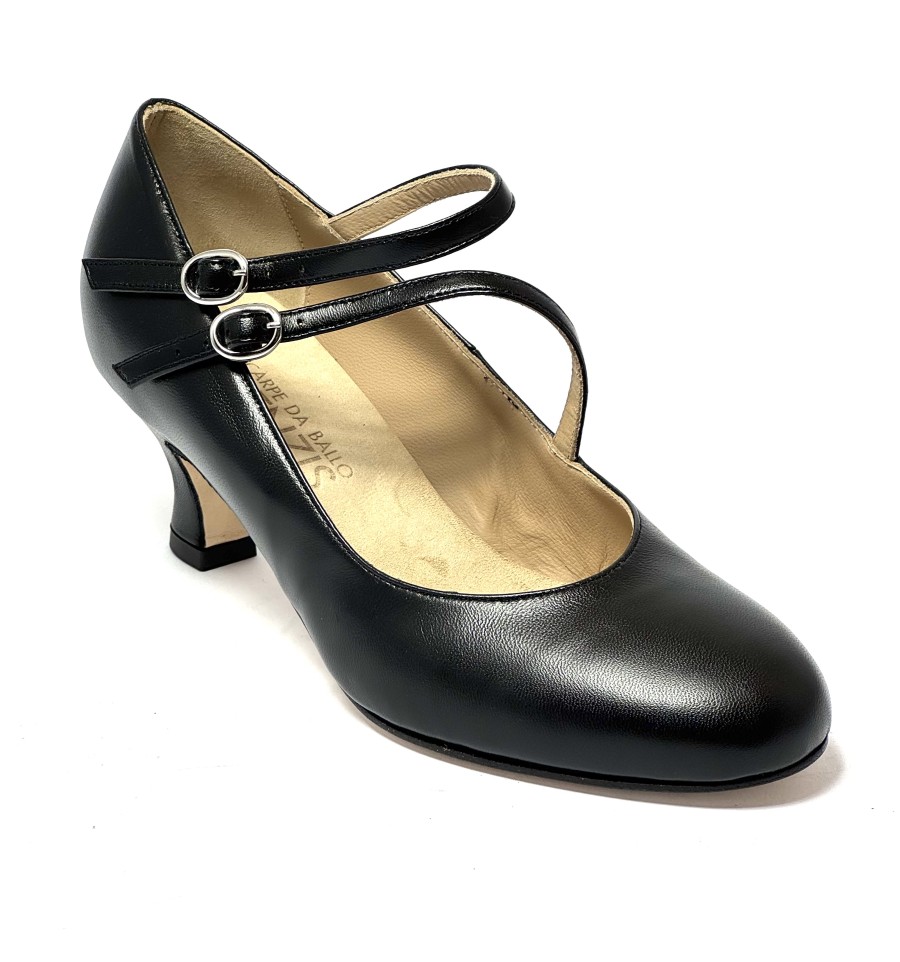 Scarpa da ballo per donna ottima per ballo da sala liscio latino americano tango punta chiusa articolo 200 sottopiede in memory foam tomaia in pelle nera con 2 cinturini uno sul collo del piede e uno sulla caviglia suola in cuoio pomiciato tacco 50