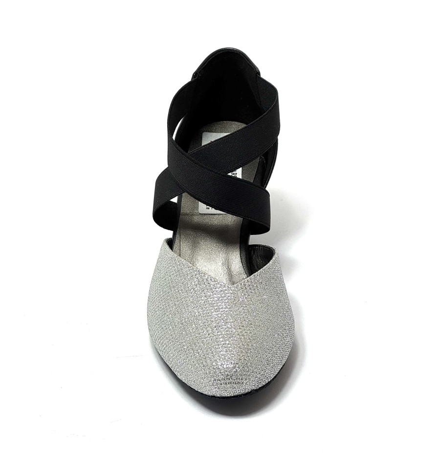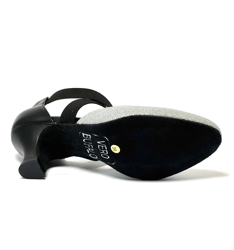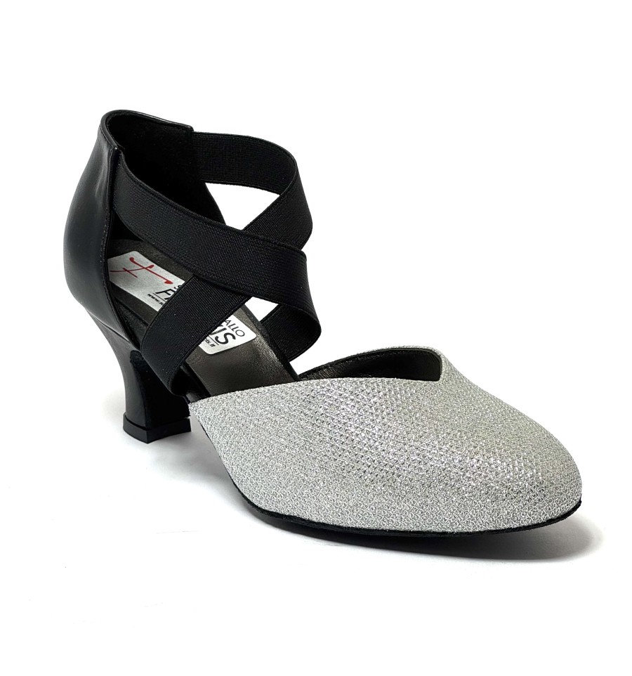 Scarpa da ballo per donna ottima per ballo da sala liscio latino tango punta chiusa articolo 07F sottopiede in memory tomaia in tessuto argento riporti in pelle nera e elastico incrociato sul collo del piede suola in bufalo tacco 50