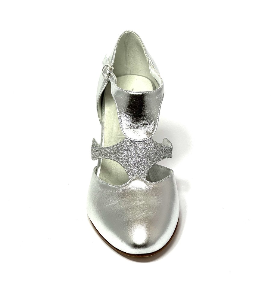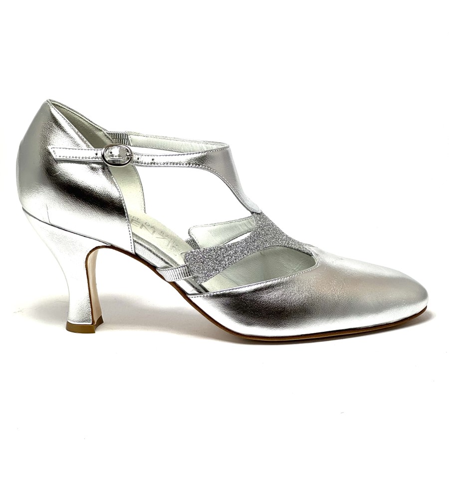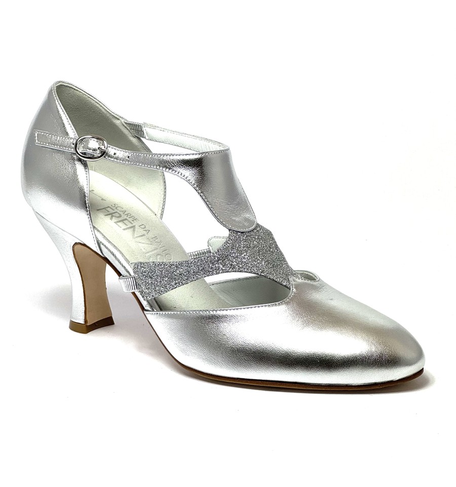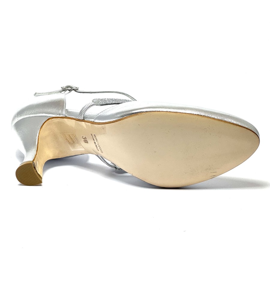 Scarpa da ballo da donna ottima per ballo da sala liscio punta chiusa sottopiede soffice tomaia in pelle argento con riporti in glitter argento suola in cuoio pomiciato tacco 70 a rocchetto