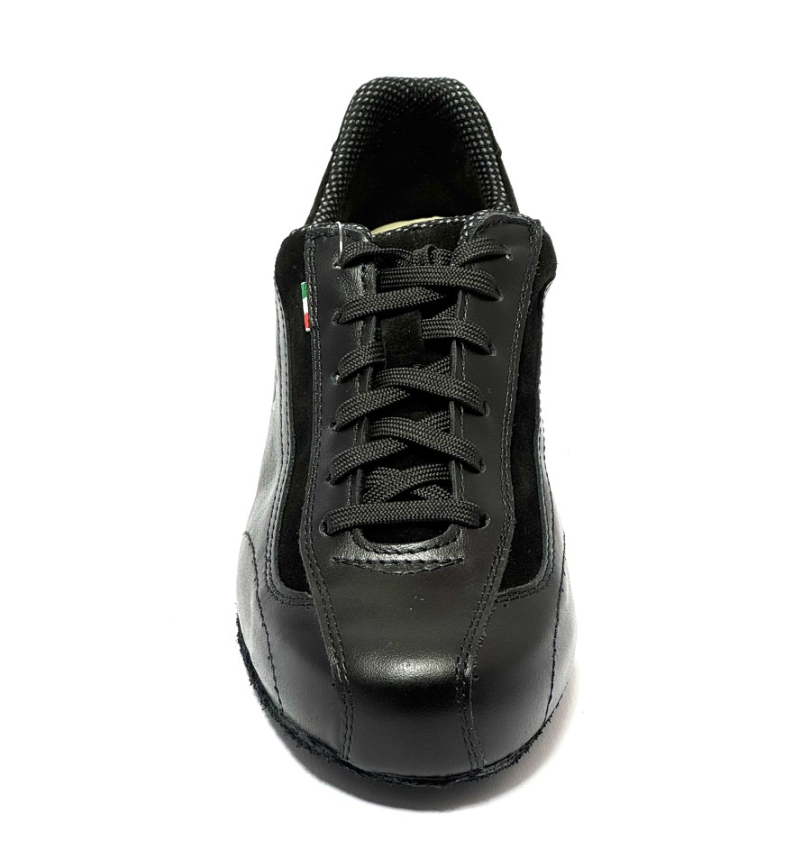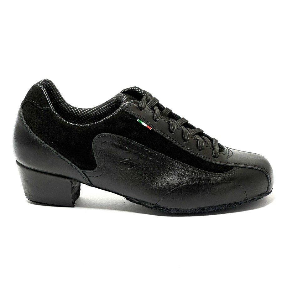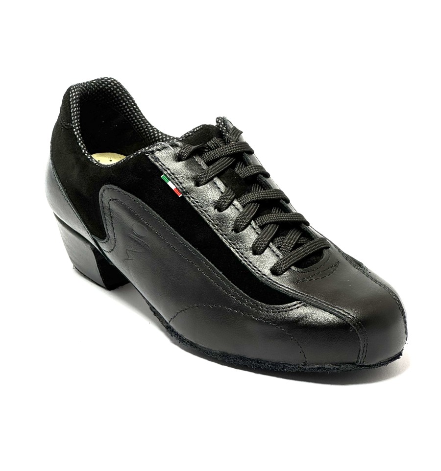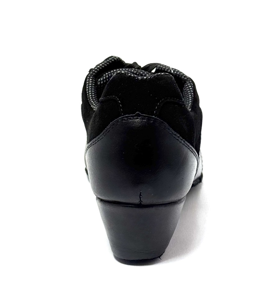 Sneakers da ballo per donna ottima per allenamento ballo da sala liscio latino americano tango argentino punta chiusa allacciata articolo SNEAKERSDONNA3 sottopiede in memory foam tomaia in pelle nera con riporti in camoscio nero suola in bufalo valvola traspirante tacco 40 largo