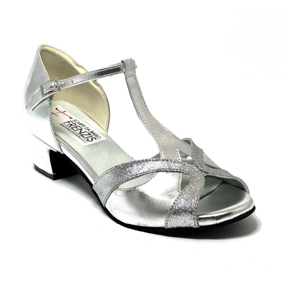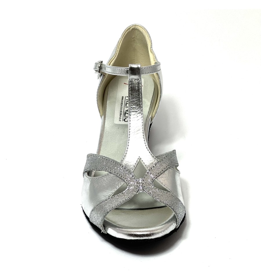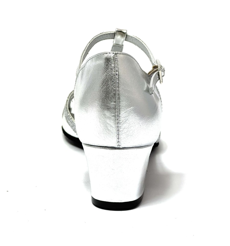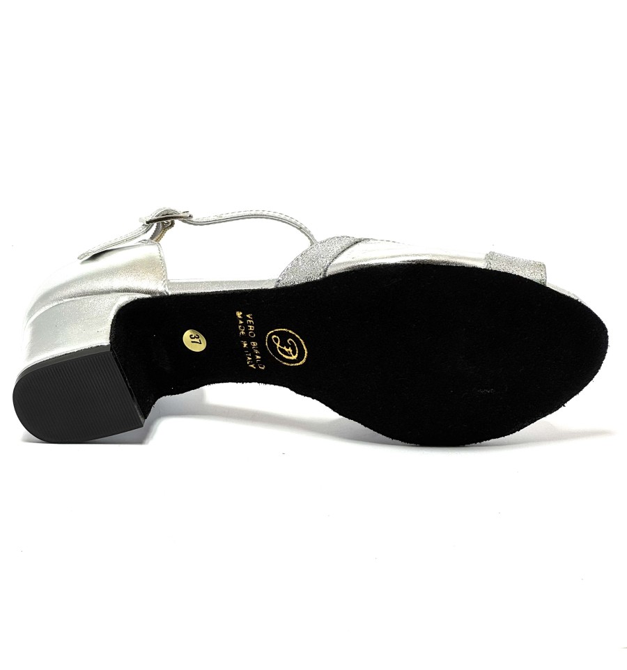 Scarpa da ballo da donna ottima per latino americano e ballo da sala liscio articolo 2022 spuntata sottopiede in Memory Foam Comfort tomaia in pelle argento con riporti in glitter argento suola in bufalo tacco 40 largo
