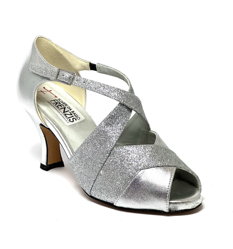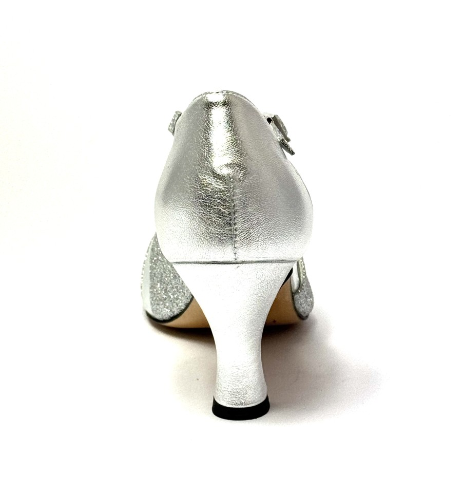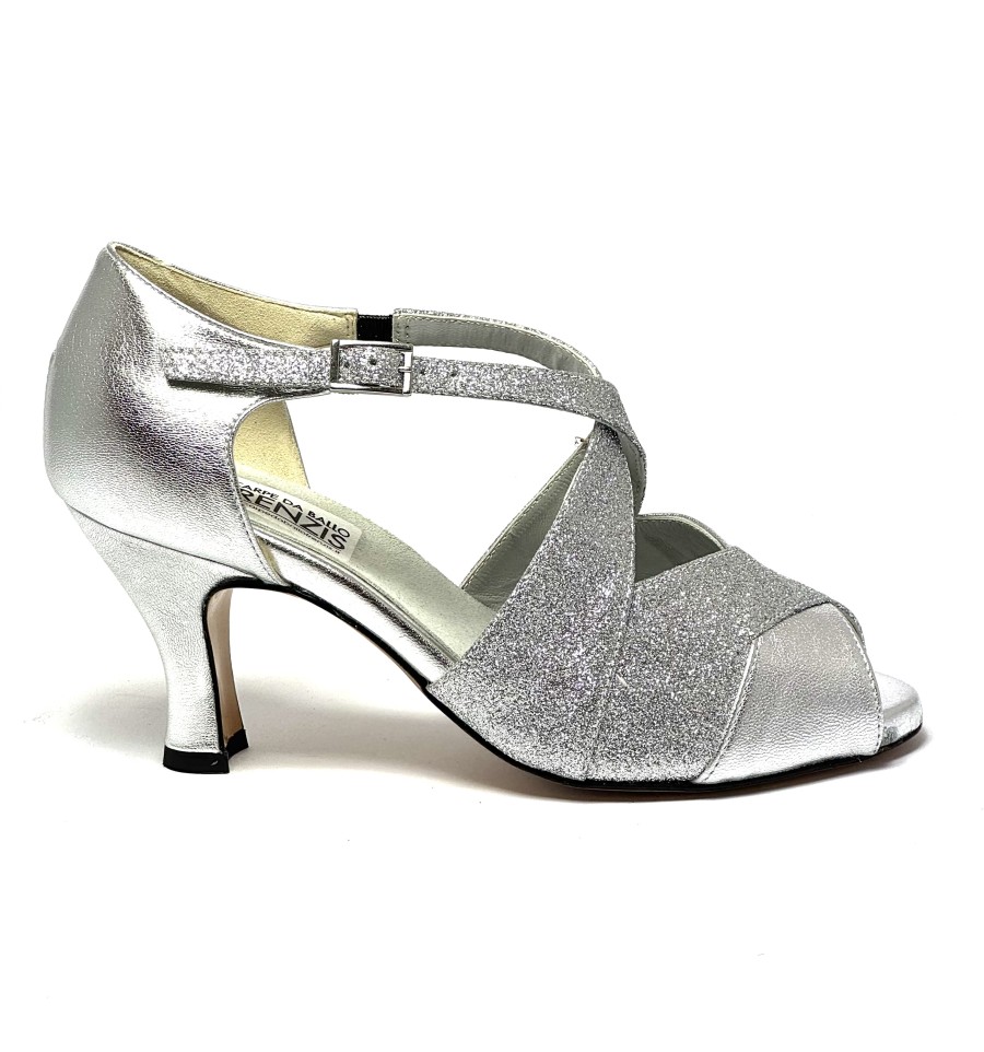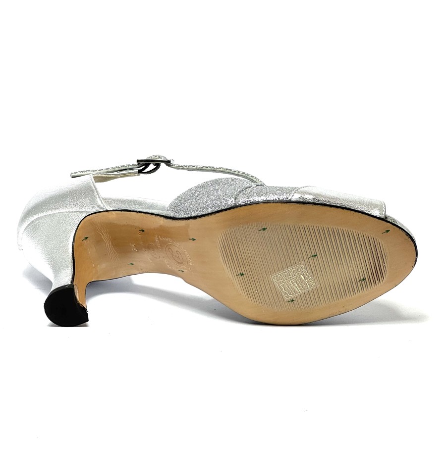 Scarpa da ballo da donna ottima per latino americano e ballo da sala liscio spuntata articolo 2081 sottopiede in Memory Foam Comfort tomaia in pelle argento con riporti in glitter argento suola in cuoio pomiciato tacco 70 a rocchetto