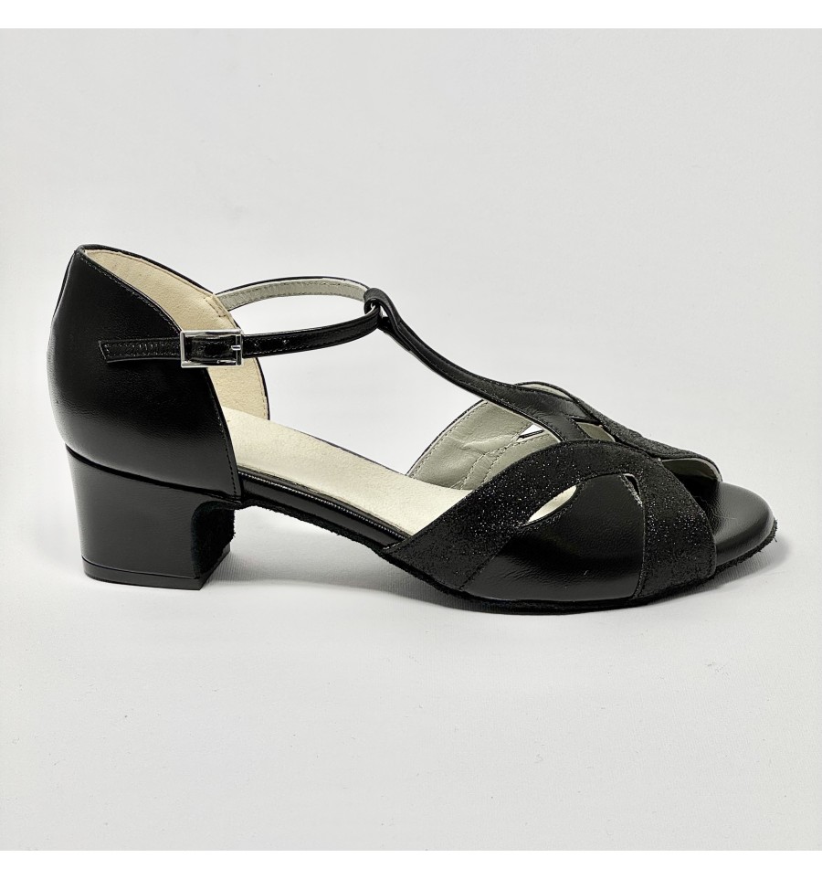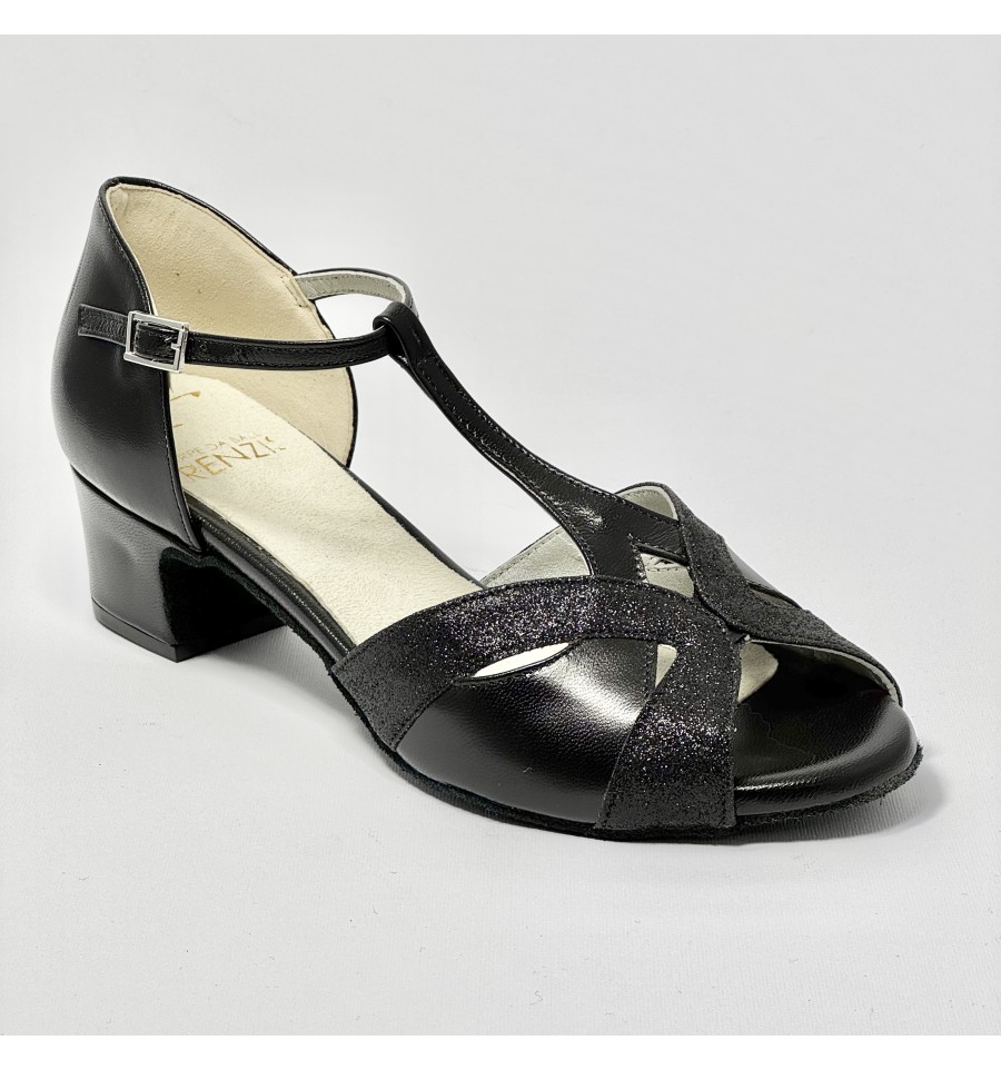 Scarpa da ballo da donna ottima per latino americano e ballo da sala liscio articolo 2022 spuntata sottopiede in Memory Foam Comfort tomaia in pelle nera con riporti in glitter nero suola in bufalo tacco 40 largo
