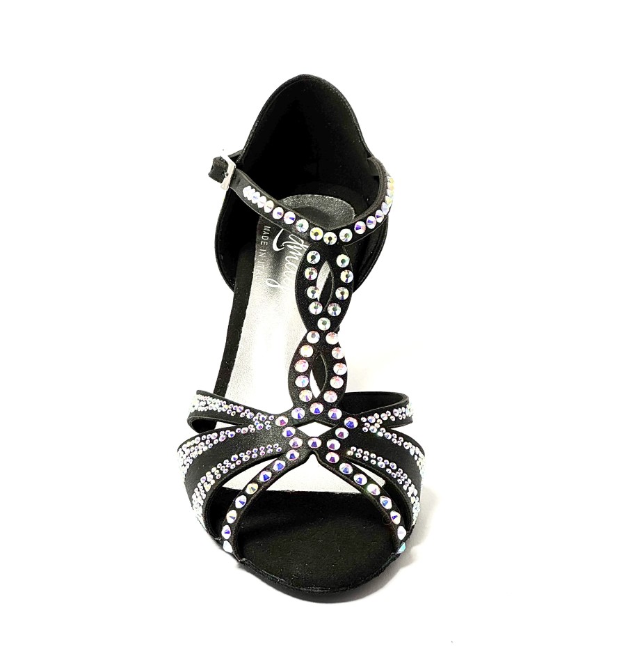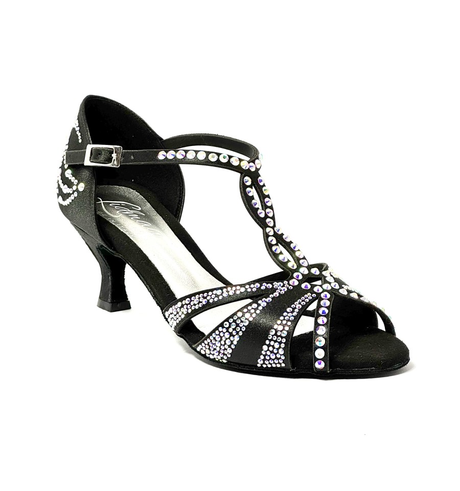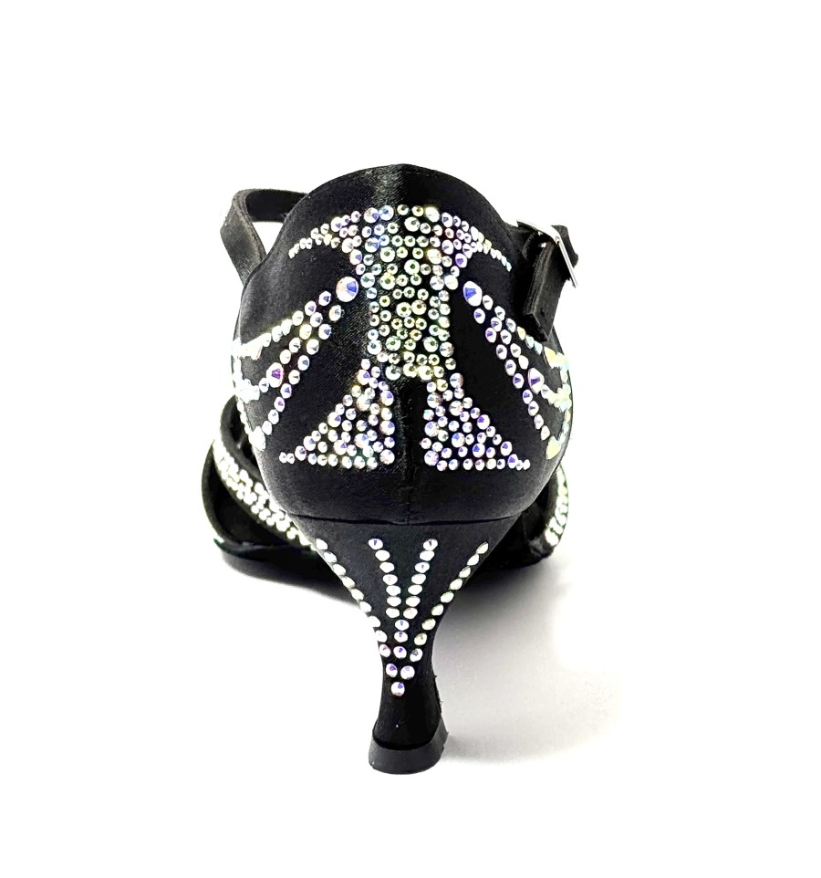 Scarpa da ballo per donna ottima per ballo latino americano e ballo da sala liscio spuntata articolo L13 sottopiede in memory tomaia in raso nero tutta decorata con strass boreali suola in bufalo tacco 60 a rocchetto