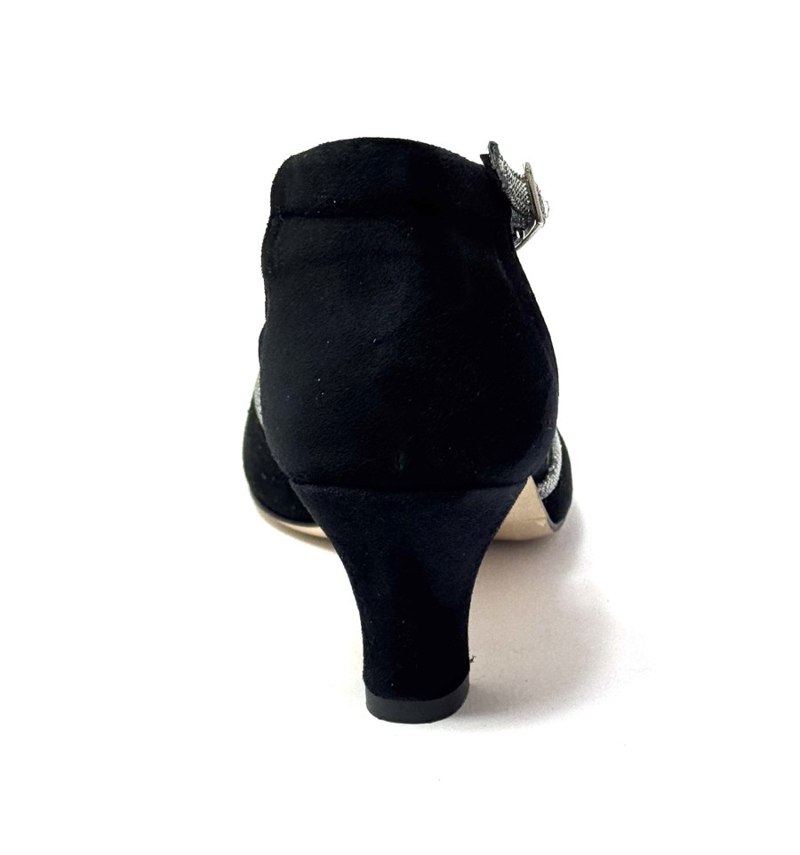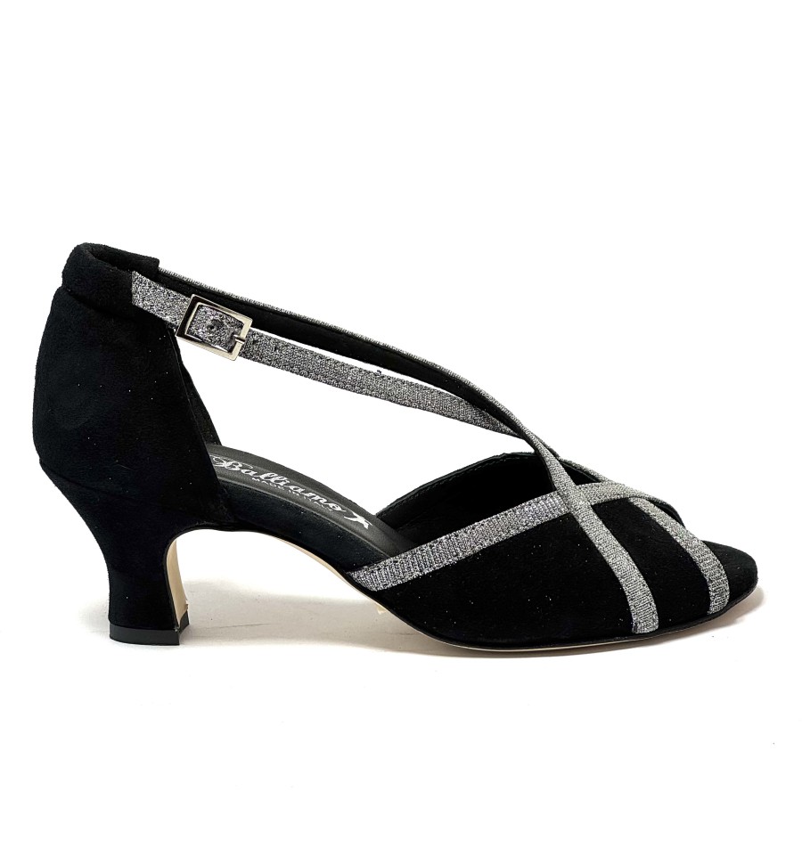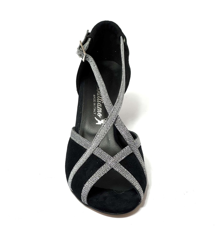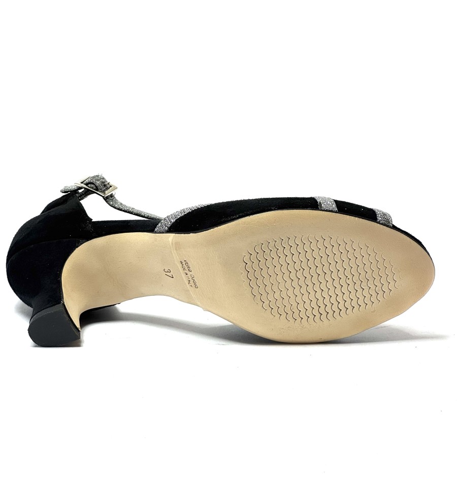 Scarpa da ballo per donna ottima per latino americano ballo da sala liscio tango spuntata articolo 419 sottopiede in memory foam tomaia in camoscio nero con riporti in tessuto galassia suola in cuoio pomiciato tacco 50
