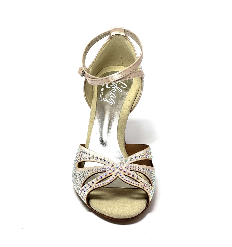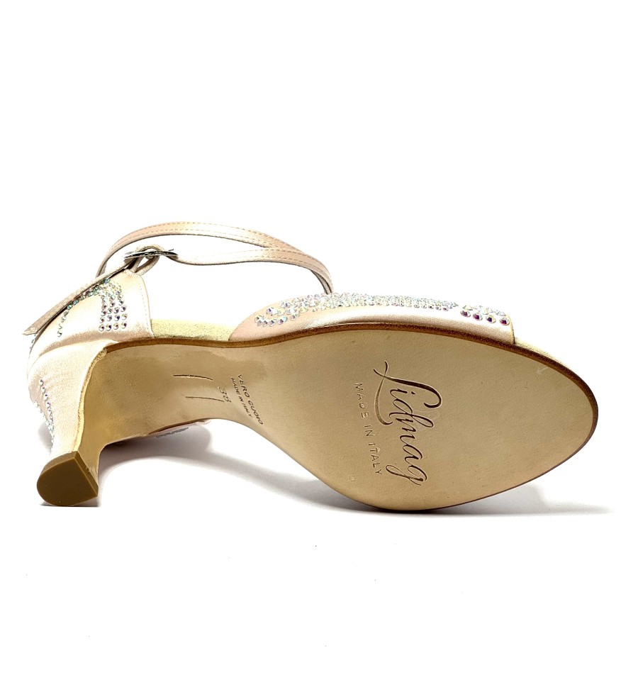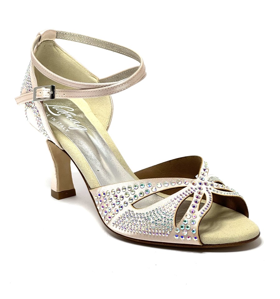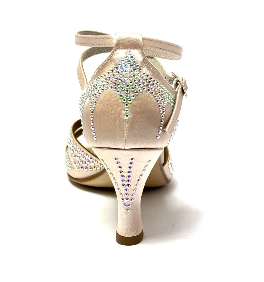Scarpa da ballo per donna ottima per ballo latino americano ballo da sala liscio tango spuntata articolo L2F sottopiede in memory foam tomaia in raso cipria tutta decorata con strass boreali suola in cuoio pomiciato tacco 70 a rocchetto