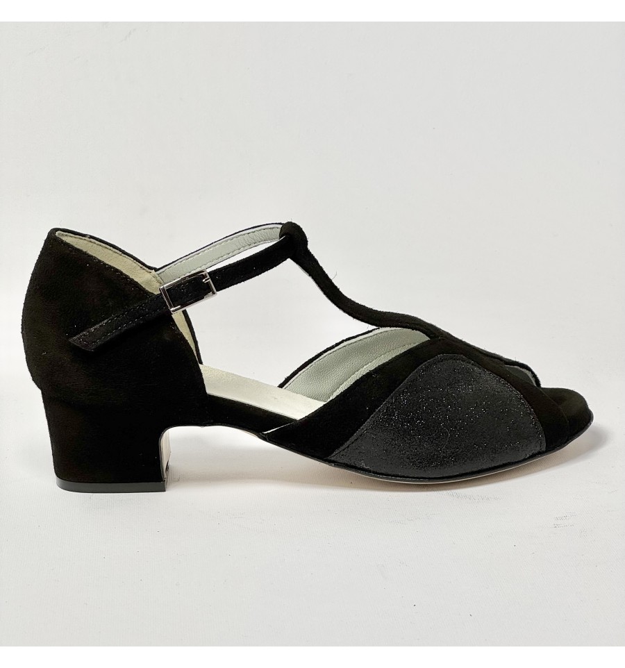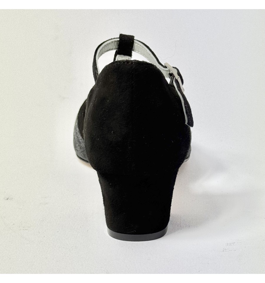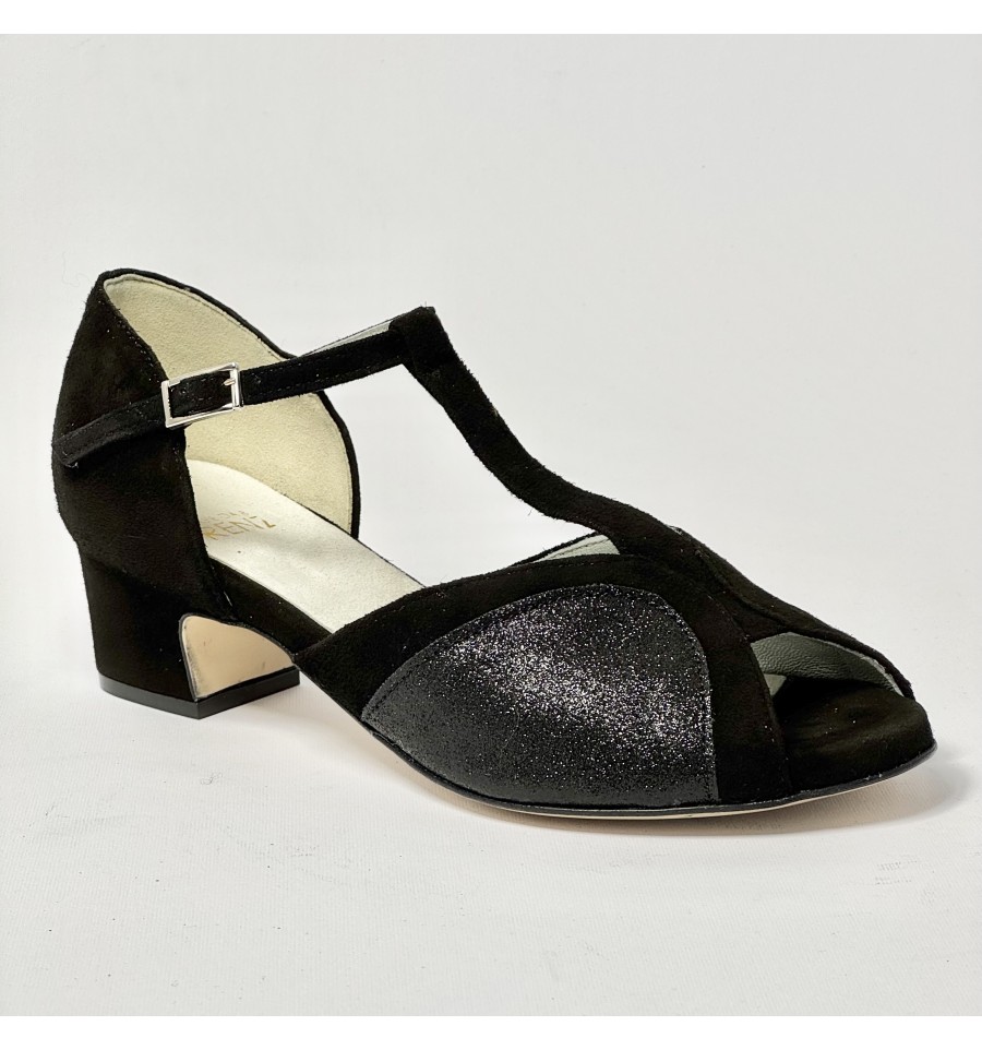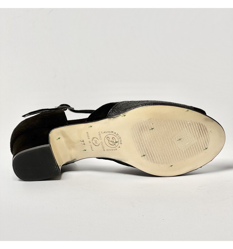 Scarpa da ballo da donna ottima per latino americano e ballo liscio da sala articolo 2384 spuntata sottopiede in Memory Foam Comfort tomaia in morbido camoscio nero con riporti in glitter nero suola in cuoio pomiciato tacco 40 largo