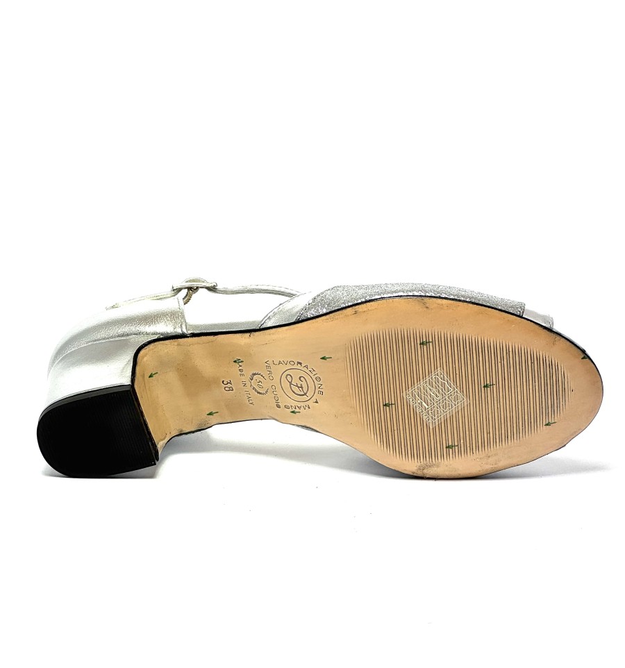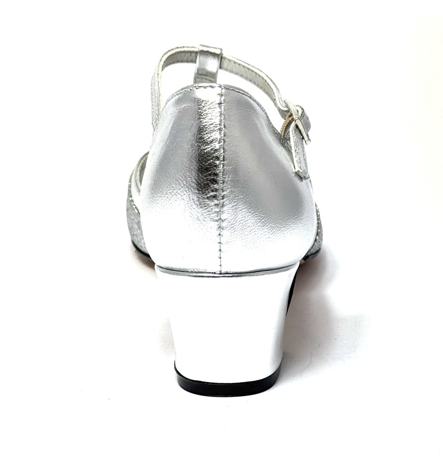 Scarpa da ballo da donna ottima per latino americano e ballo liscio da sala articolo 2384 spuntata sottopiede in Memory Foam Comfort tomaia in morbida pelle argento con riporti in glitter argento suola in cuoio pomiciato tacco 40 largo e stabile
