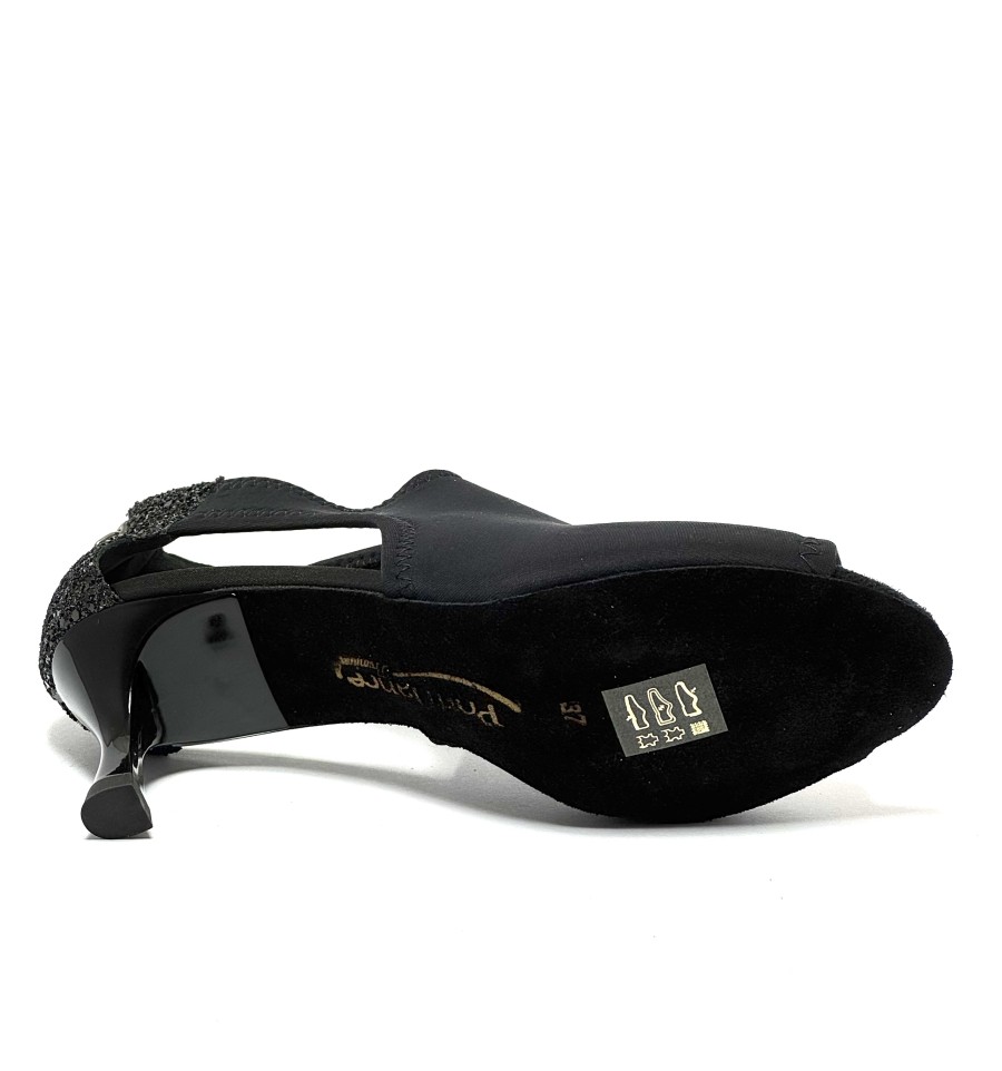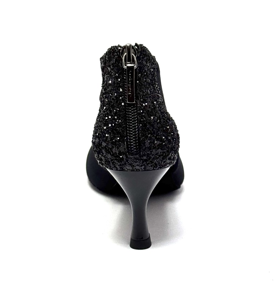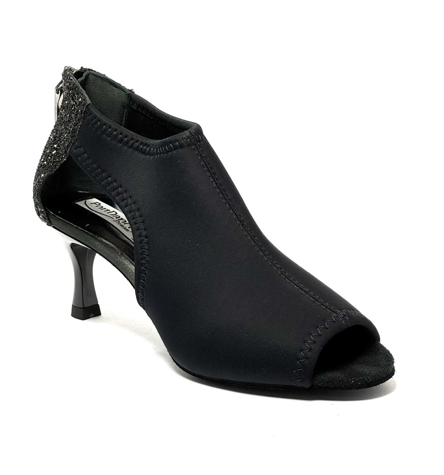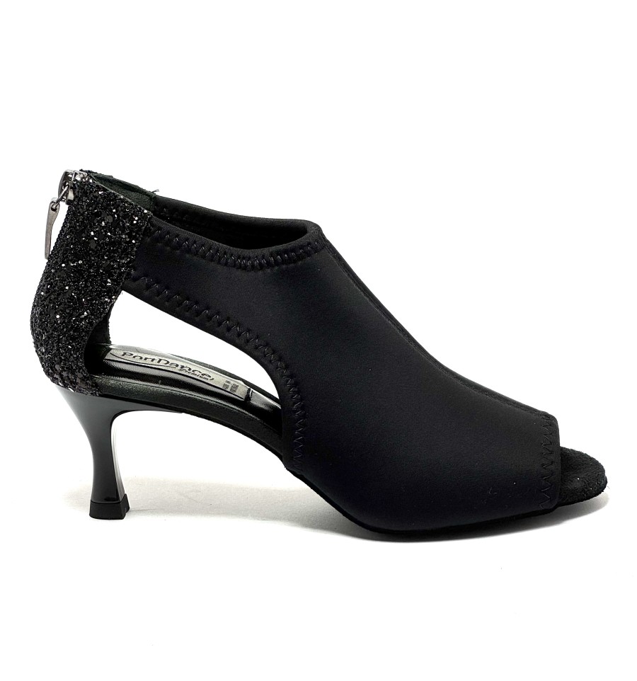 Scarpa da ballo per donna ottima per ballo latino americano salsa bachata ballo da sala liscio tango spuntata zip posteriore sul tallone sottopiede in memory foam tomaia in morbido neoprene nero con ripoti in glitter nero suola in bufalo tacco 60 a rocchetto