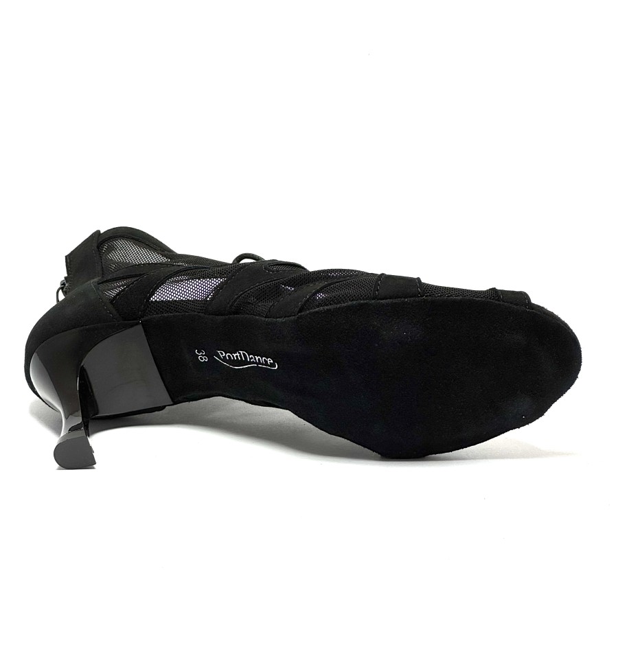 Scarpa da ballo per donna ottima per ballo latino americano salsa bachata kizomba ballo da sala liscio tango spuntata allacciata con zip posteriore sul tallone sottopiede in memory foam tomaia in nabuk nero con riporti in rete elasticizzata nera suola in bufalo tacco 60 a rocchetto
