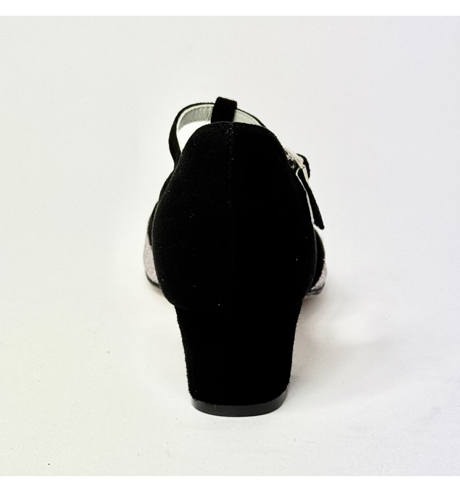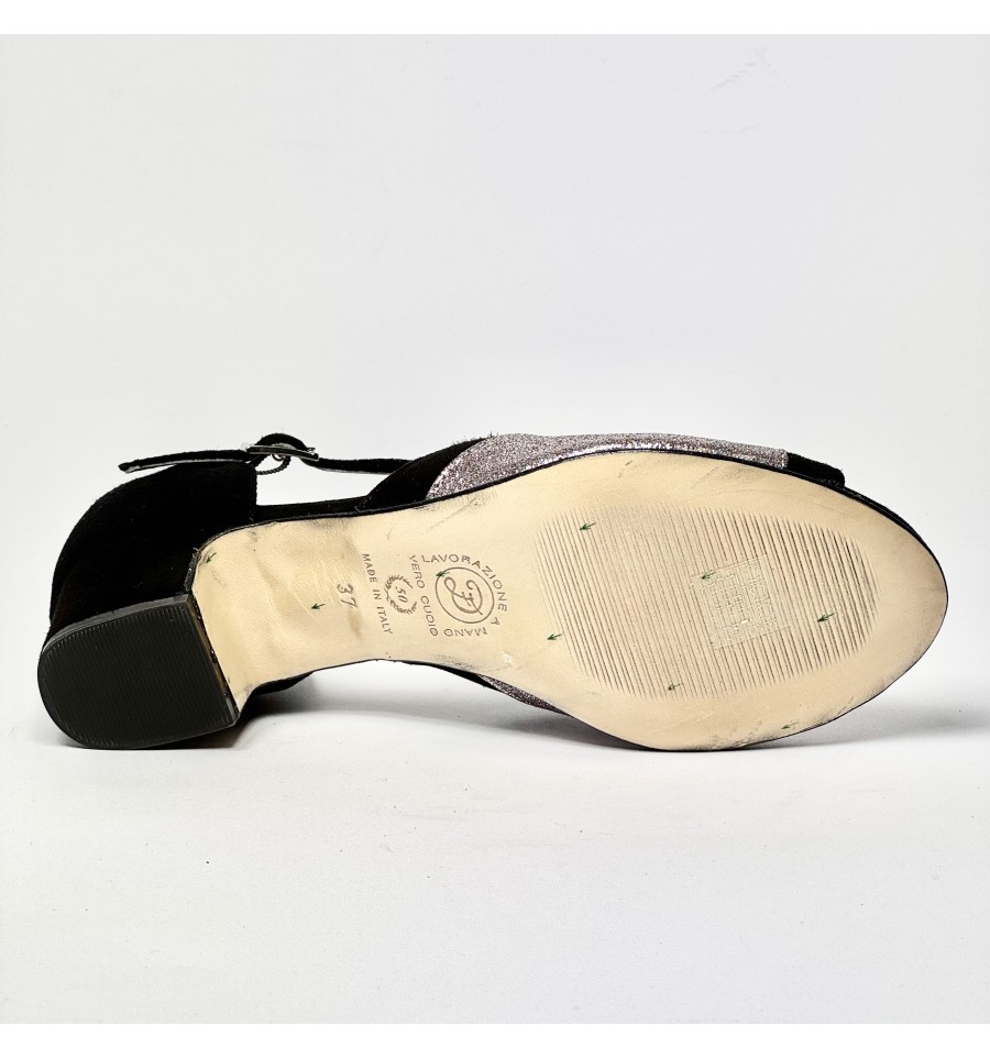 Scarpa da ballo da donna ottima per latino americano e ballo da sala liscio, articolo 2384 spuntata sottopiede in Memory Foam Comfort, tomaia in camoscio nero con riporti in glitter arcobaleno, suola in cuoio pomiciato ideale per ogni pavimentazione tacco 40 largo e stabile