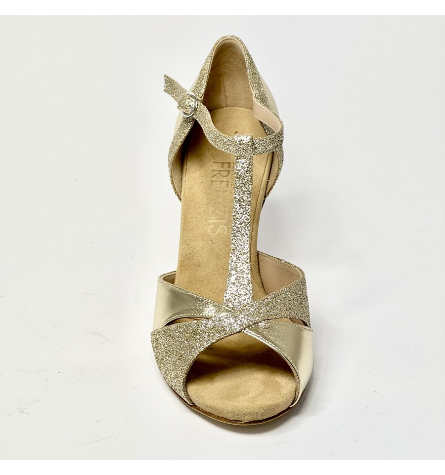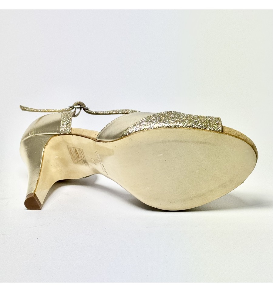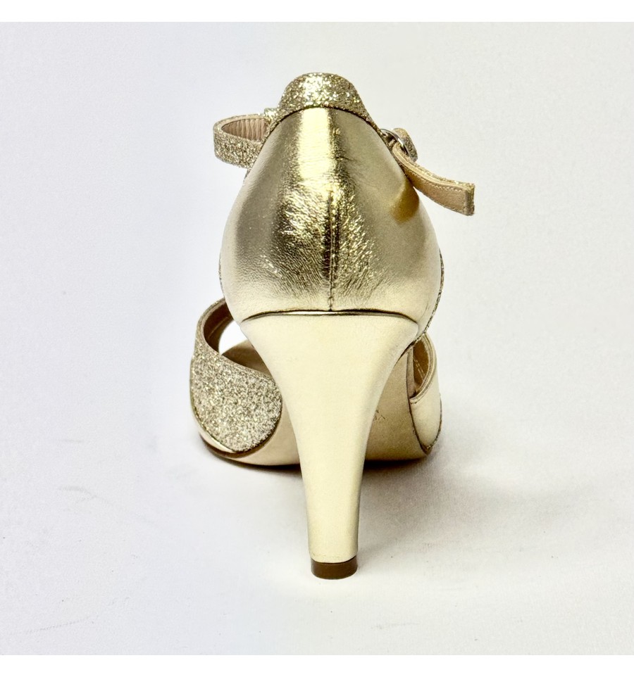 Scarpa da ballo da donna ottima per latino americano tango argentino e ballo da sala liscio articolo 161PL spuntata plateau di 1 cm tomaia in pelle platino con riporti in glitter platino suola in cuoio pomiciato tacco 80 a stiletto