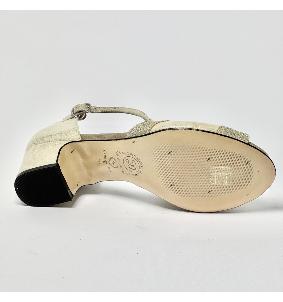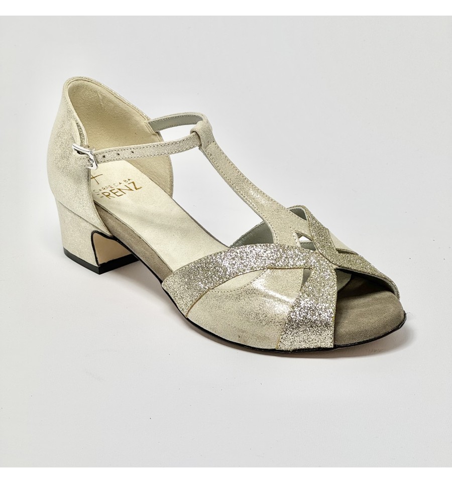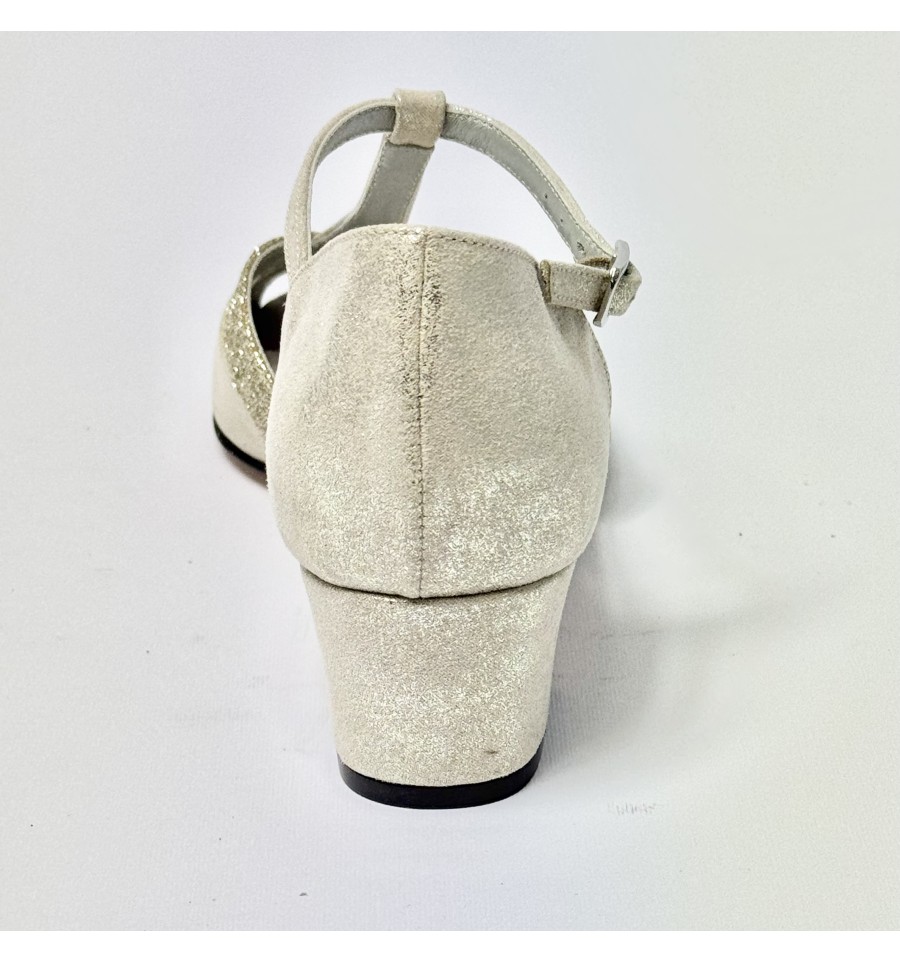Scarpa da ballo da donna ottima per latino americano e ballo da sala liscio articolo 2022 sottopiede in Memory Foam Comfort tomaia in nabuk miele/platino con riporti in glitter platino suola in cuoio pomiciato tacco 40 largo