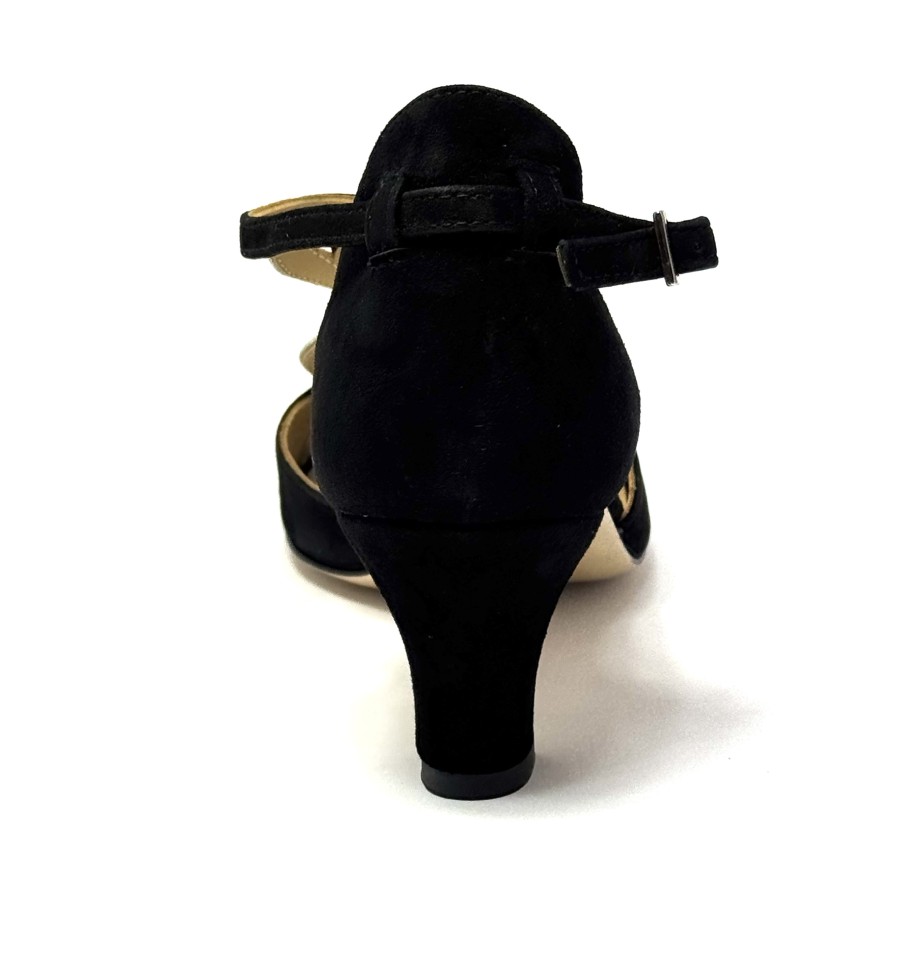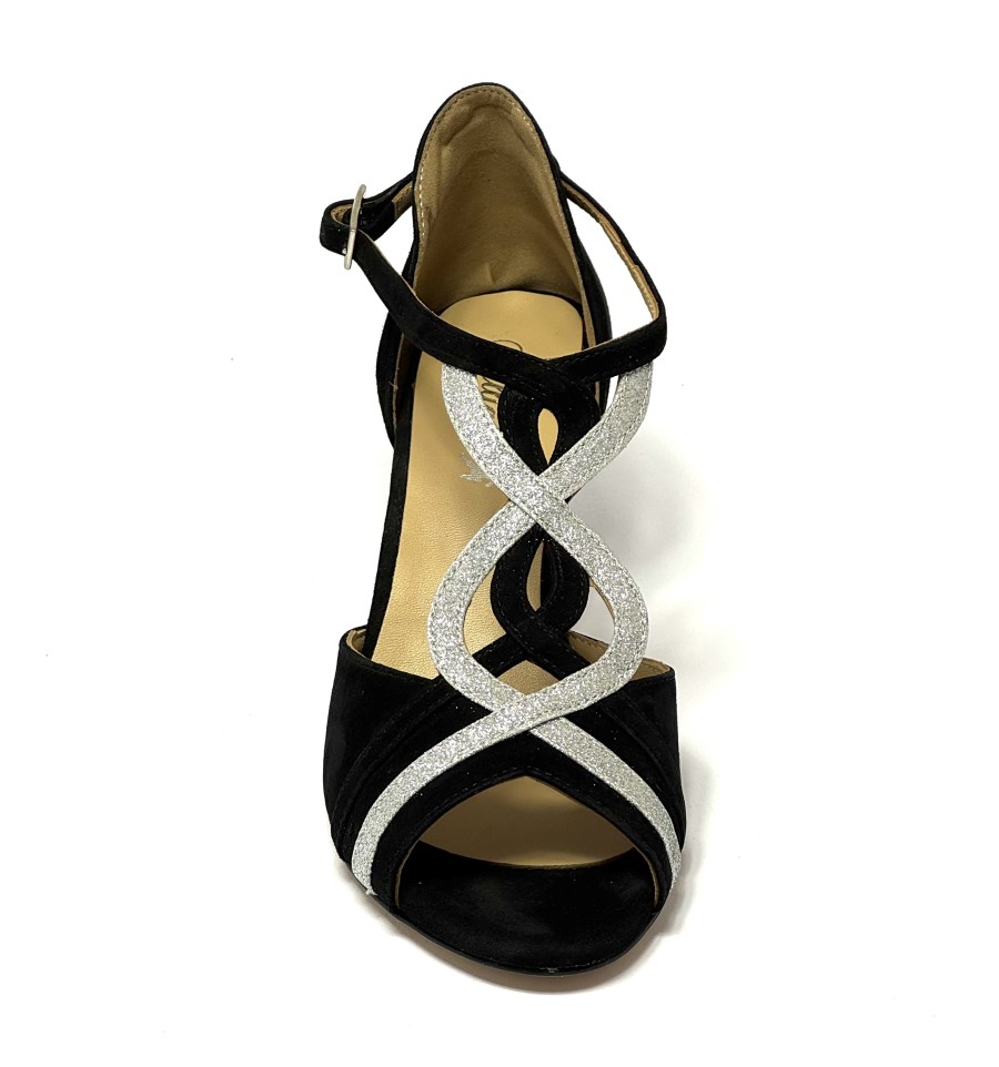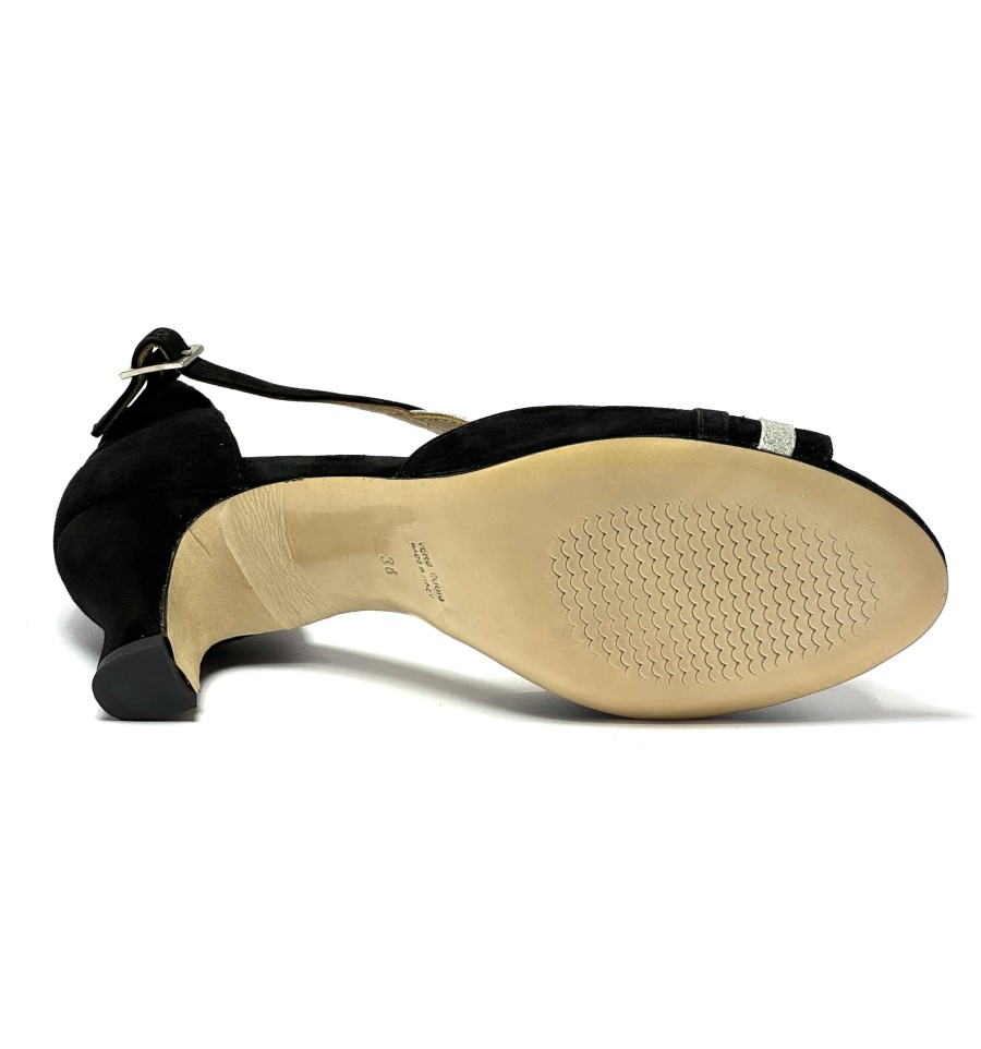 Scarpa da ballo per donna ottima per ballo latino americano balli caraibici ballo da sala tango spuntata articolo 168 sottopiede in memory foam tomaia in camoscio nero con riporti in glitter argento suola in cuoio pomiciato tacco 50