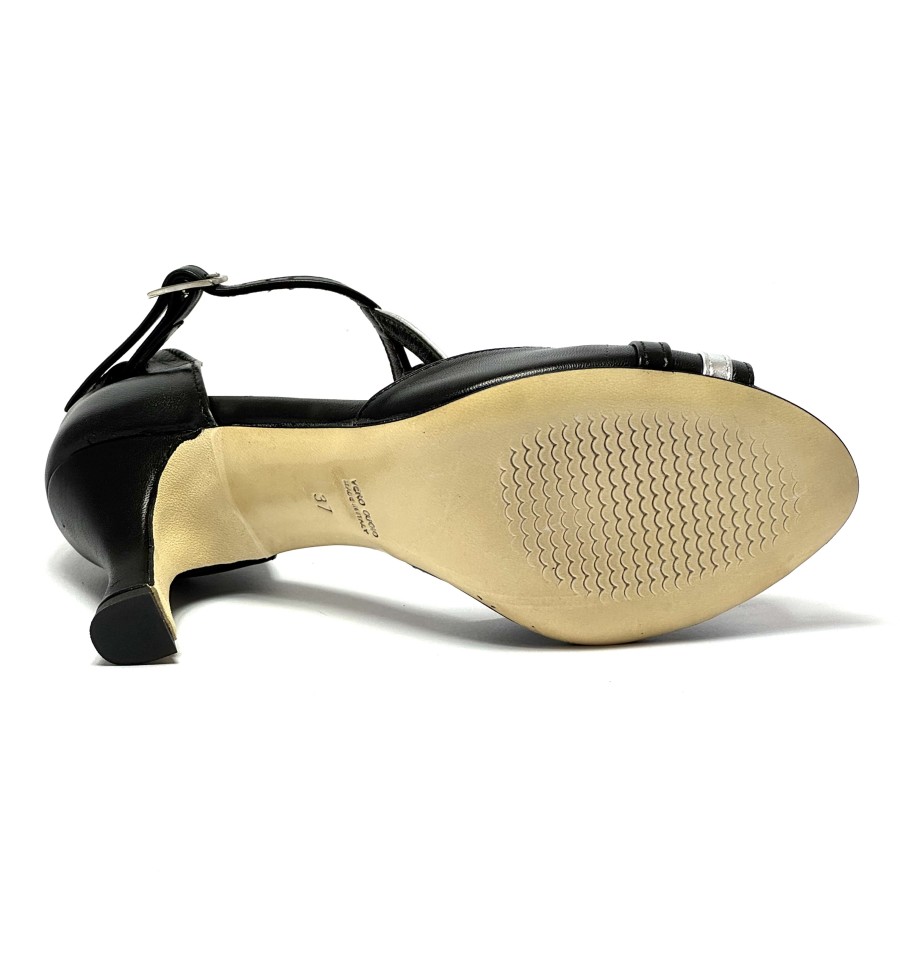 Scarpe da ballo per donna ottime per ballo latino americano caraibici ballo da sala liscio tango spuntata articolo 168 sottopiede in memory foam tomaia in pelle nero con riporti in pelle argento suola in cuoio pomiciato tacco 70 a rocchetto