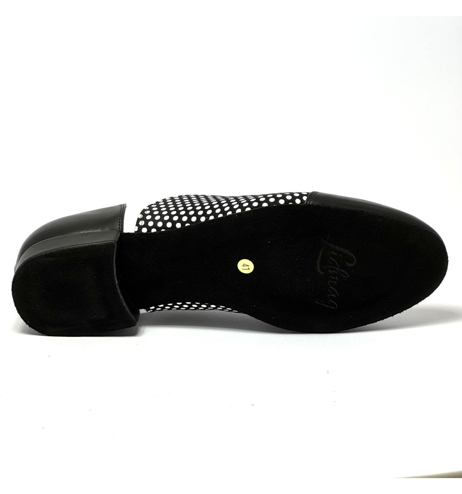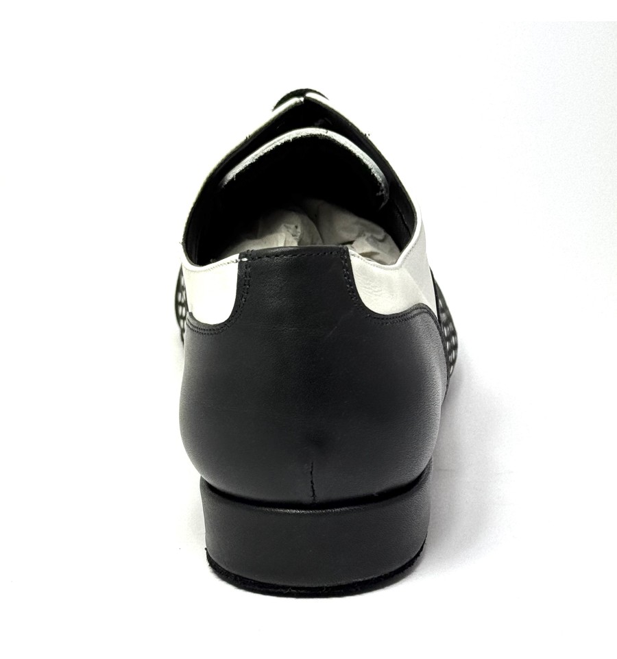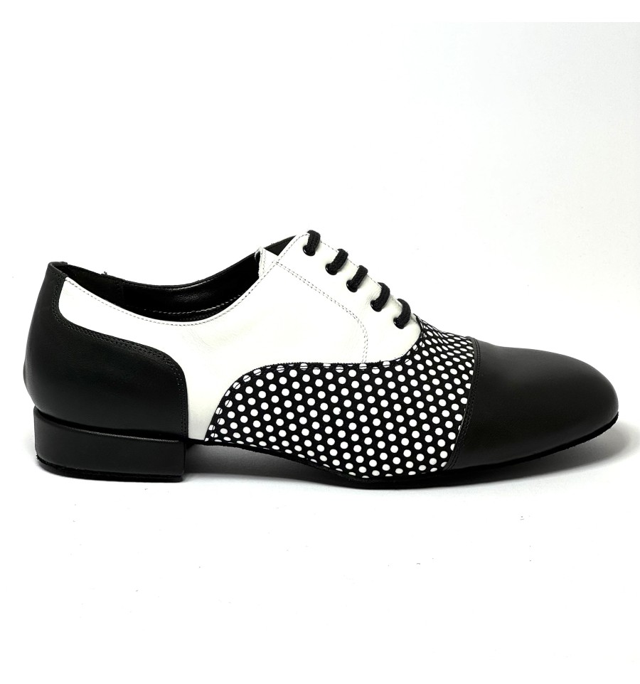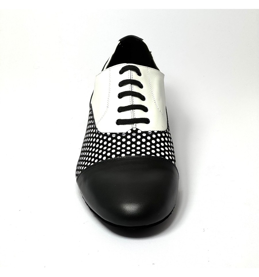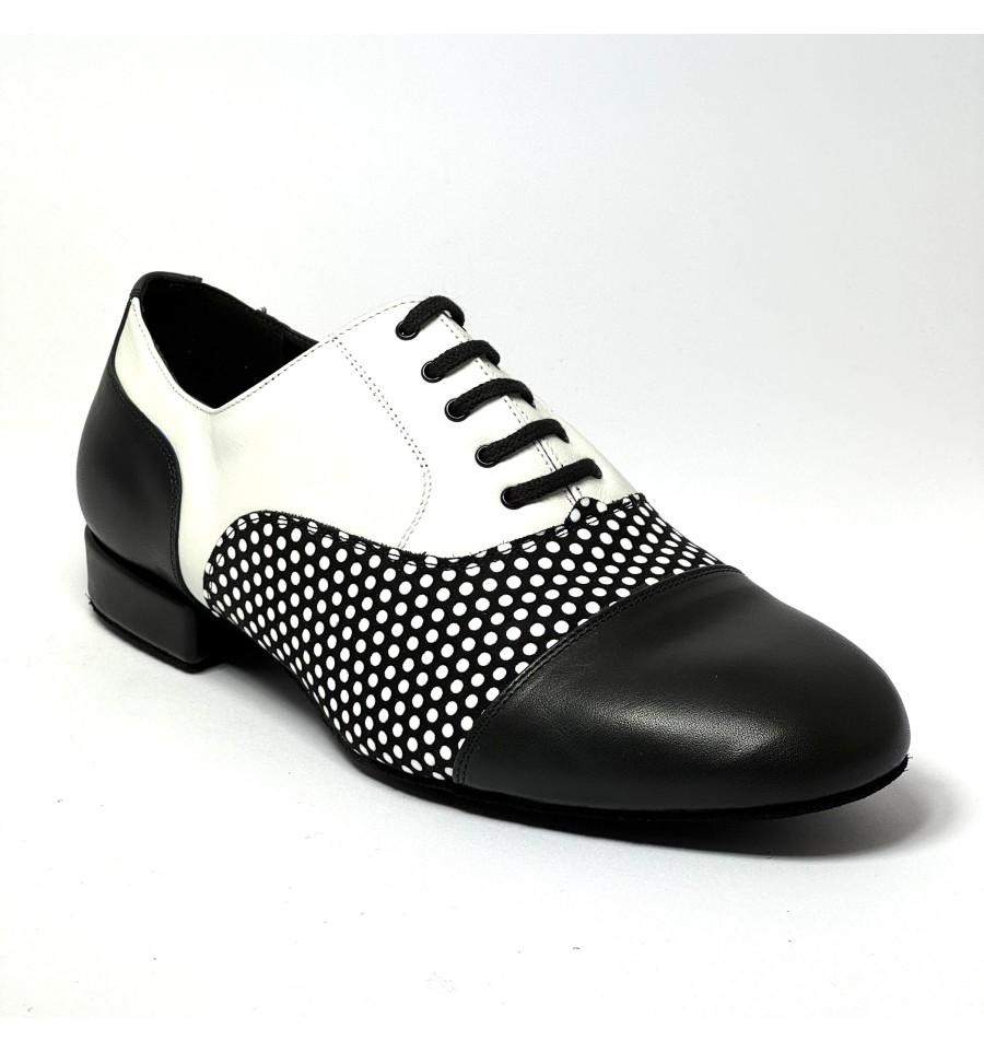 Scarpa da ballo per uomo ottima per ballo da sala liscio latino americano tango argentino allacciata articolo 825 sottopiede in memory tomaia in pelle nera a pois bianchi suola bufalo tacco 20