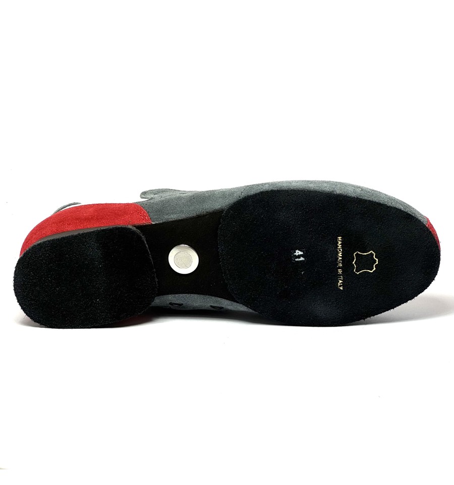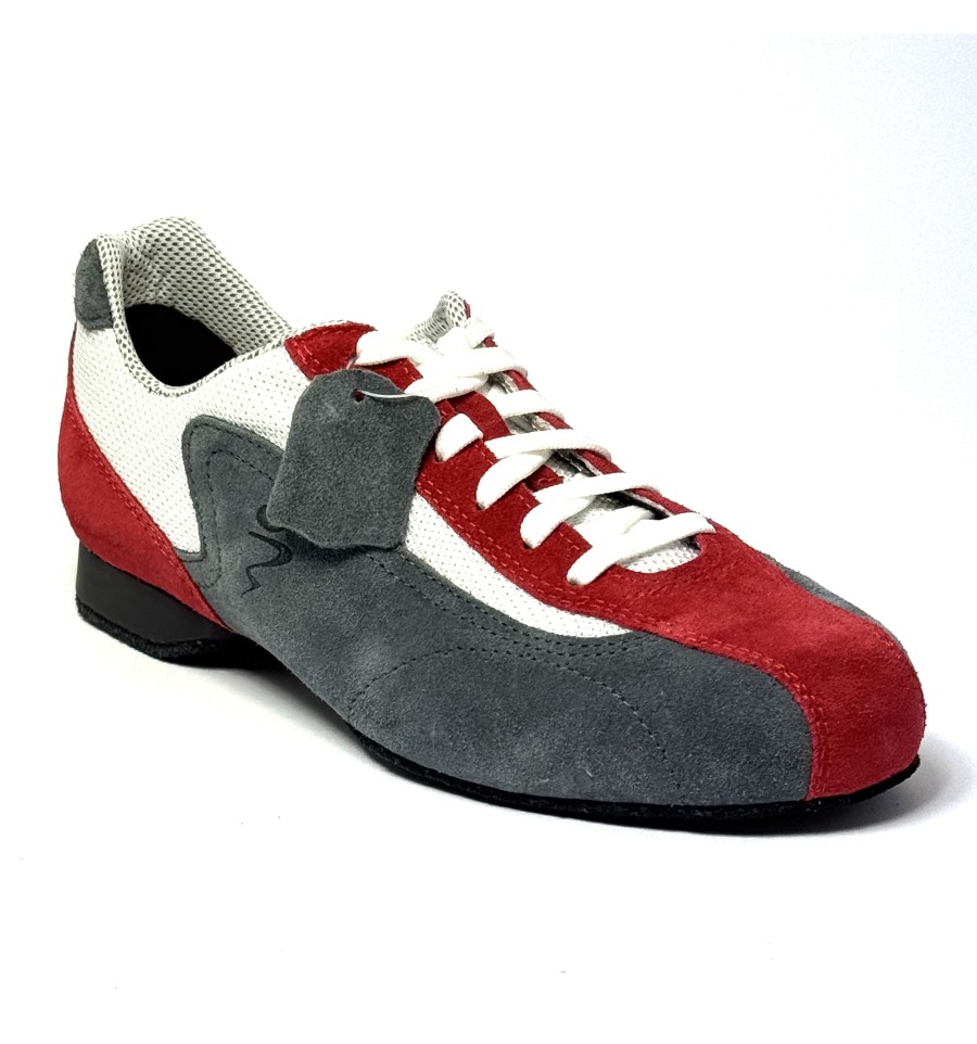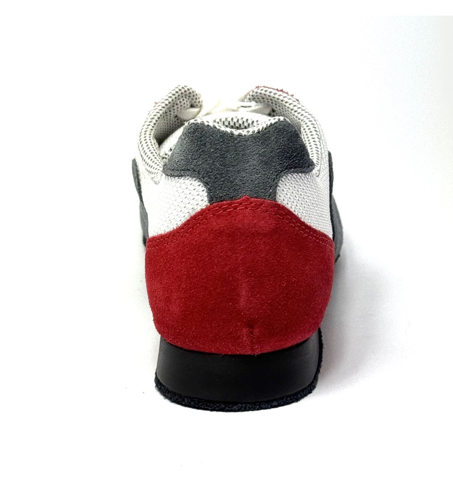 Scarpa da ballo sneakers da uomo ottima per latino americano tango argentino e ballo da sala liscio allacciata articolo SNEAKERS3B sottopiede in memory tomaia in tessuto traspirante bianco con riporti in camoscio rosso e grigio con valvola traspirante suola in bufalo tacco 20